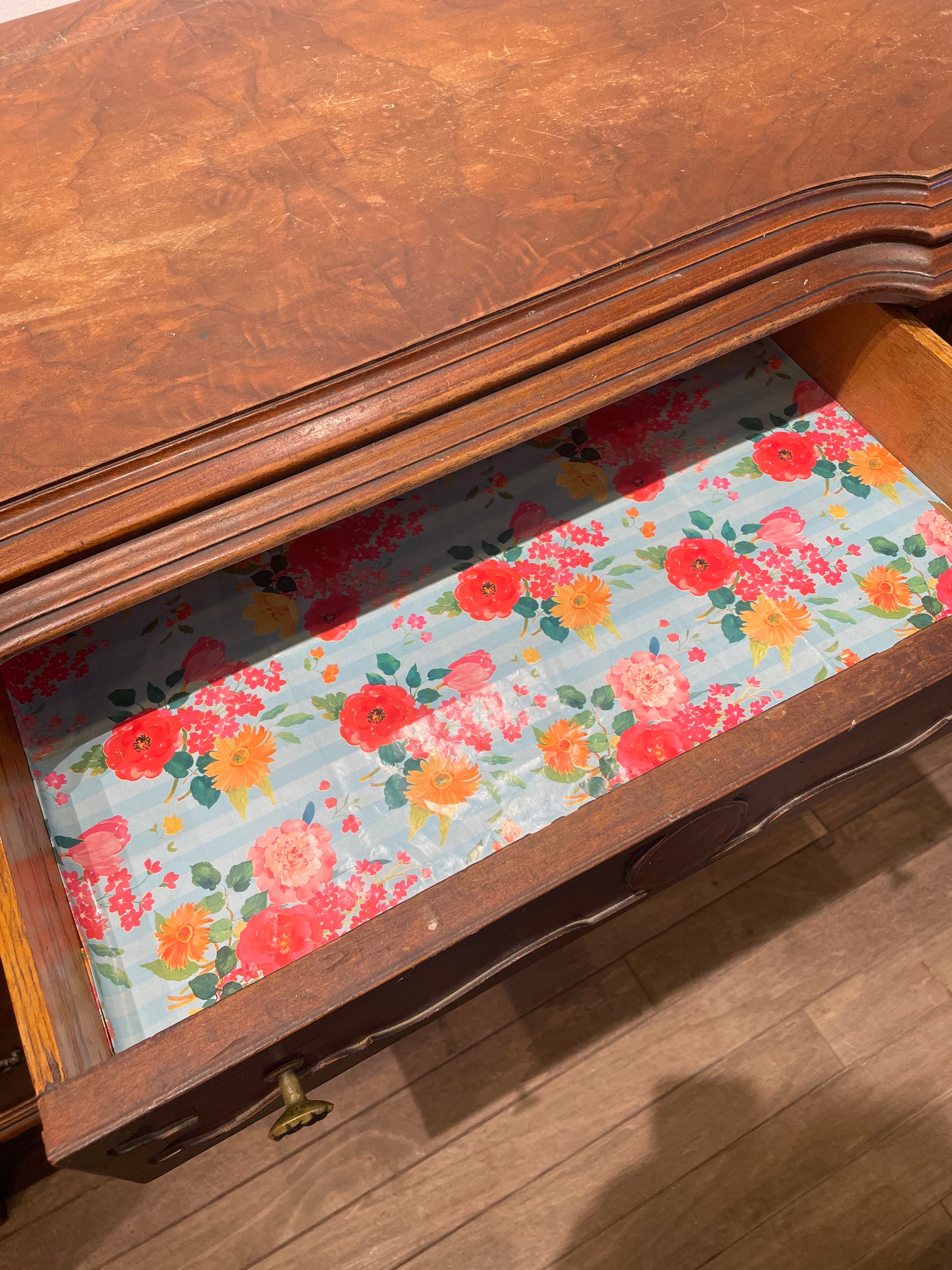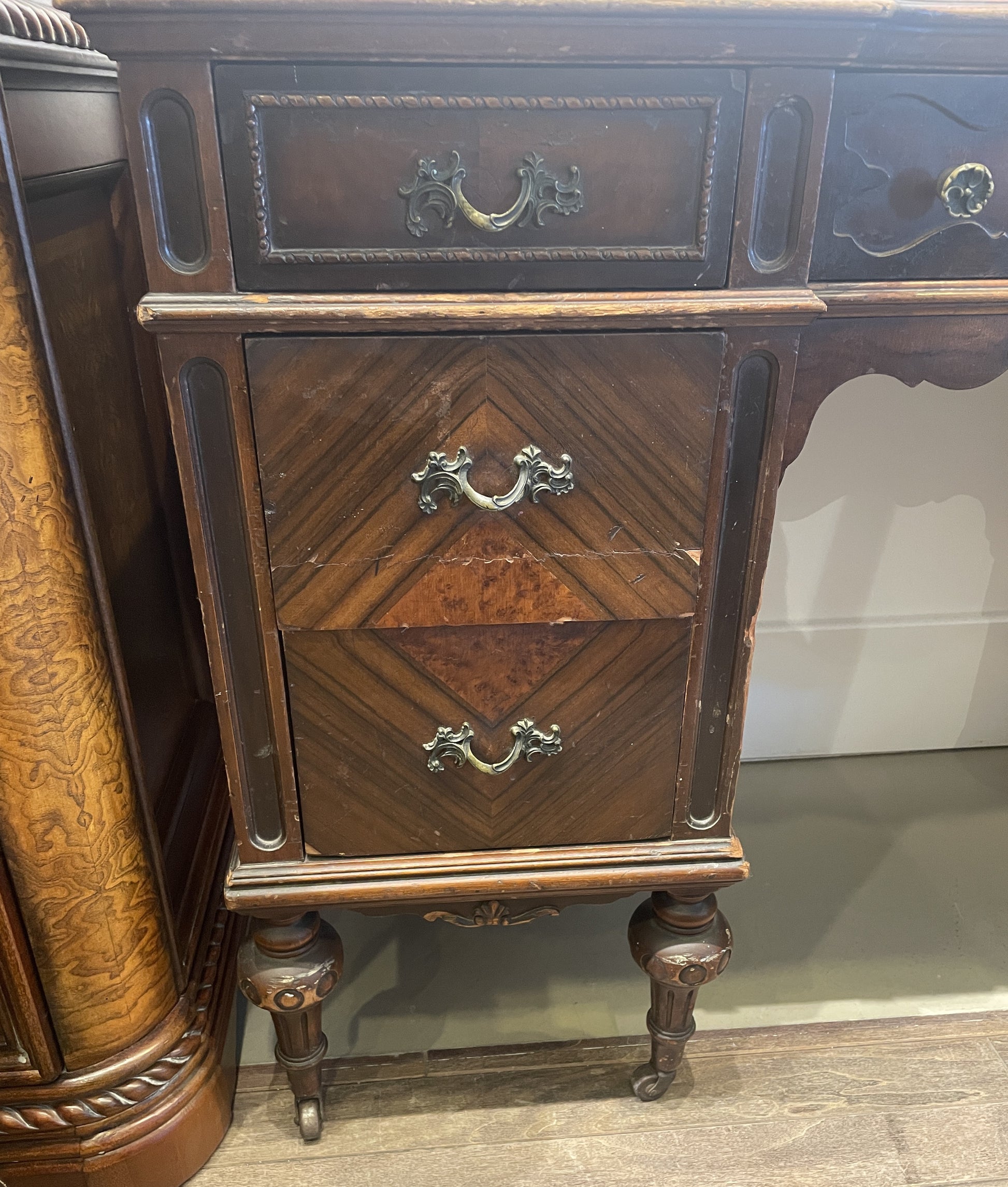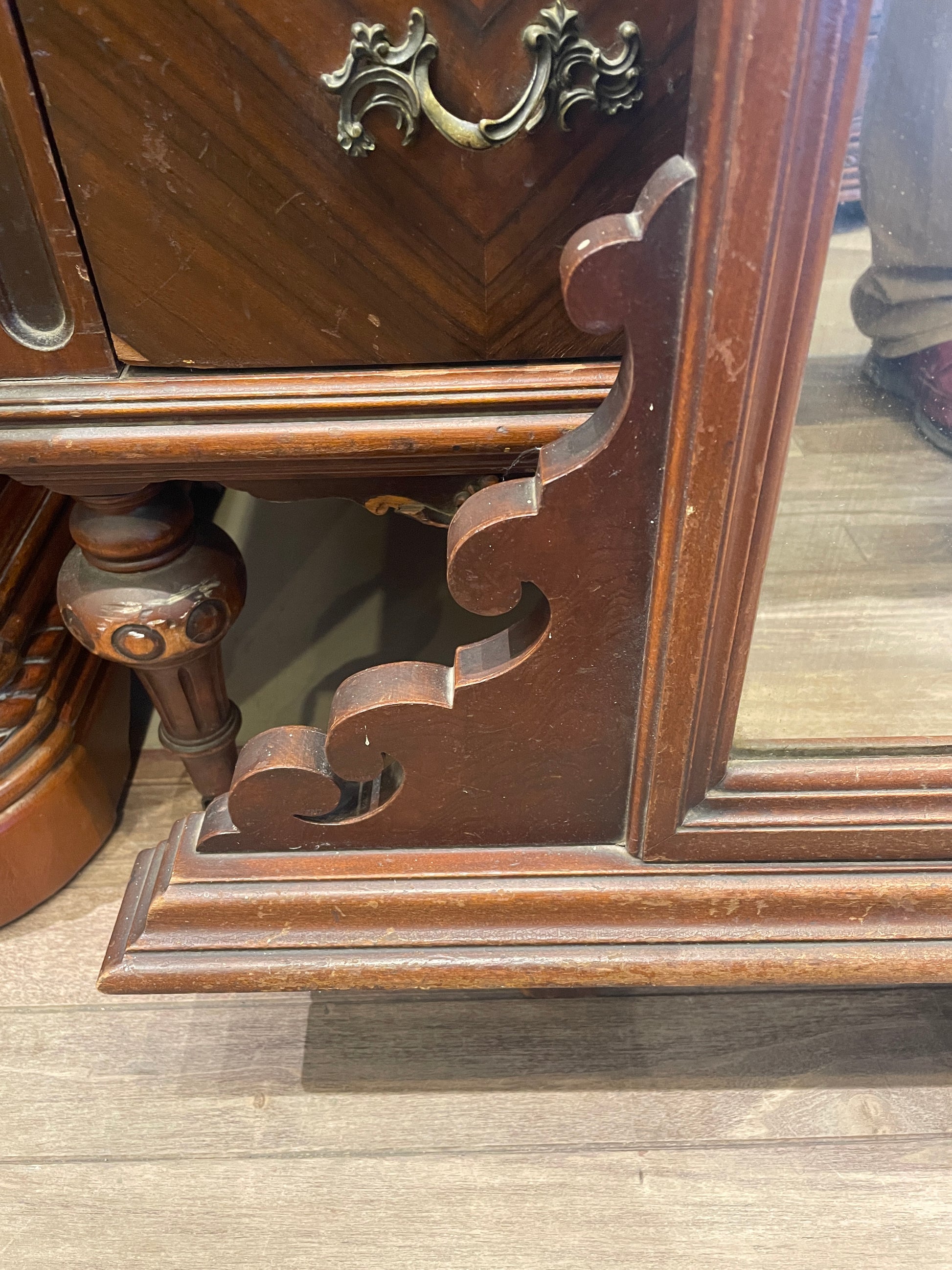 Vanity with bench. This gorgeous piece features a vanity with a beautifully ornamented mirror and a small bench. The medium-toned wooden vanity sits on tapered legs with fluted details that are capped with brass casters for easy motility. It has seven drawers, each of which with brass pulls. The side drawers have handles with an intricate scrolled design, and the center drawer has two small brass pull knobs with a simpler design. The vanity includes an arched mirror with carved details on its frame. The bench has a similar style to the rest of the vanity with tapered fluted legs connected by an H-stretcher. The oval seat is upholstered with a cream colored fabric and has a slight back edge extending from the frame. This gorgeous vanity is full of charm with its intricate designs and timeless craftsmanship.