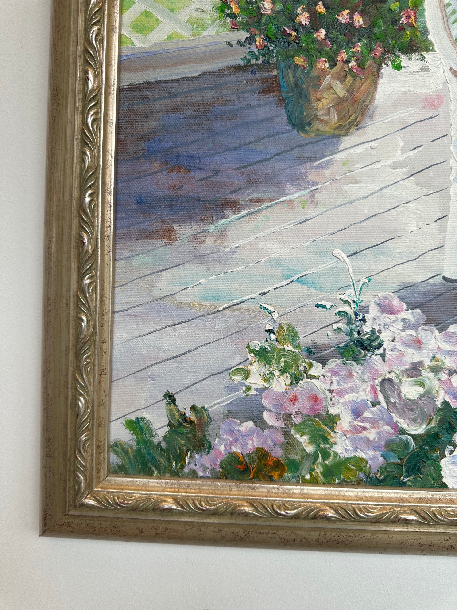 Oil on canvas painting of a garden scene signed "Vedanta '02" in the bottom right corner. Depicts a large garden with a table for two and blooming flowers. Features green, blue, pink, and purple tones with white accents. Painting is held in a gilded frame with a subtle carved pattern.