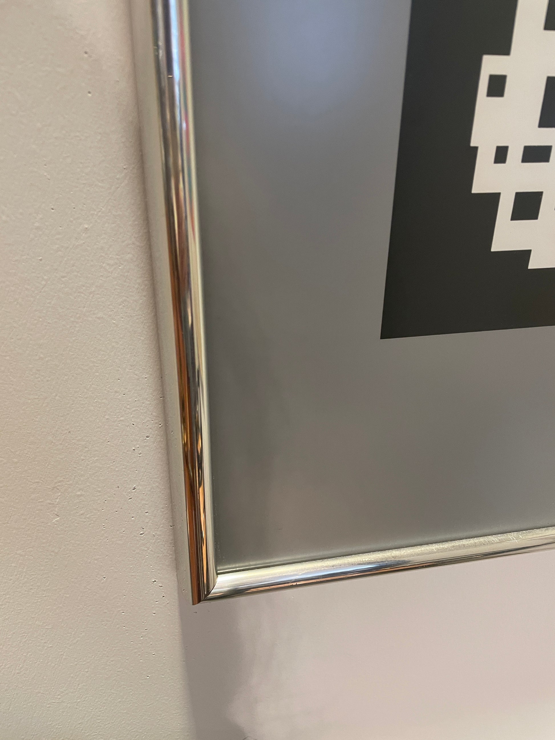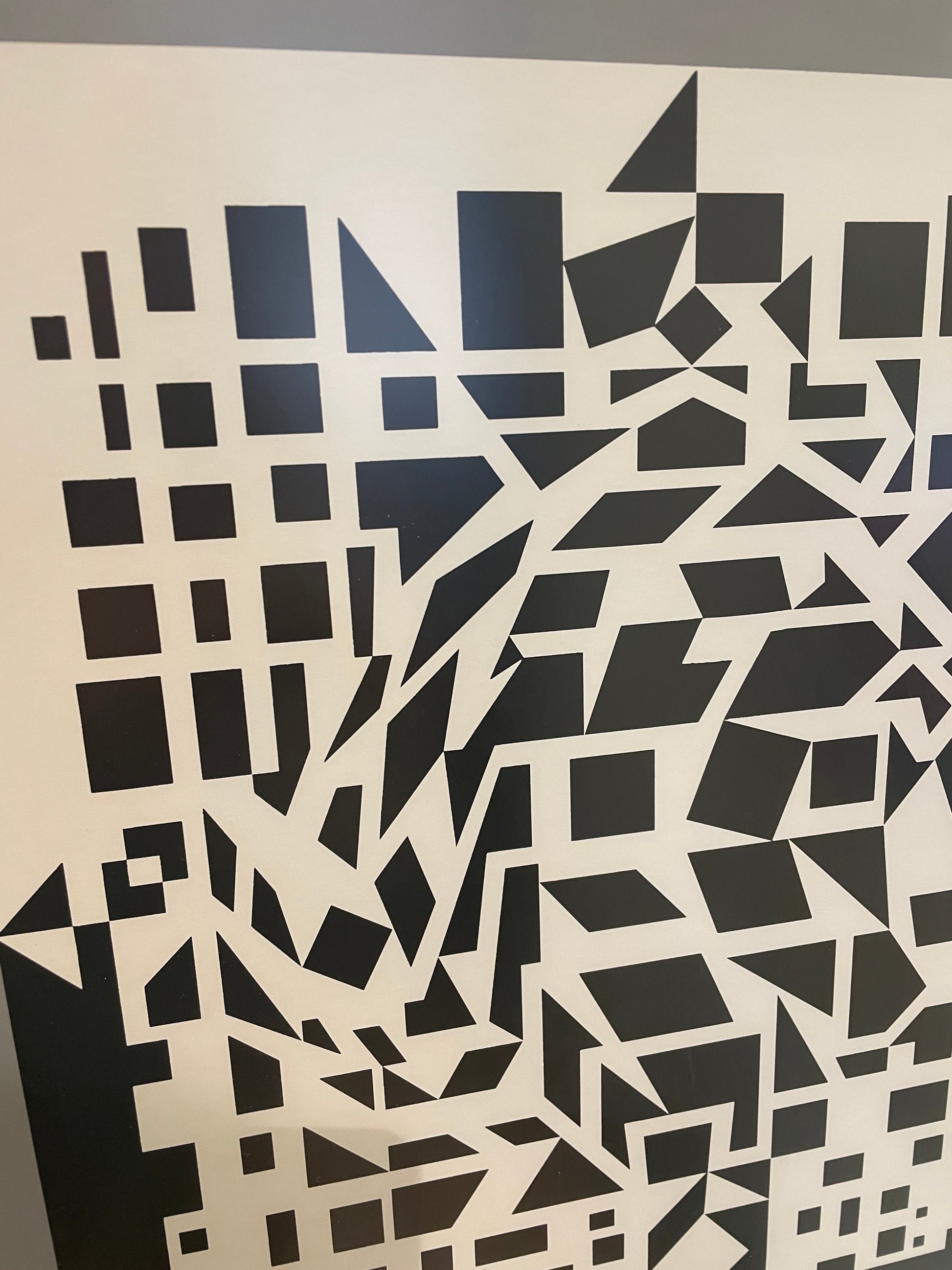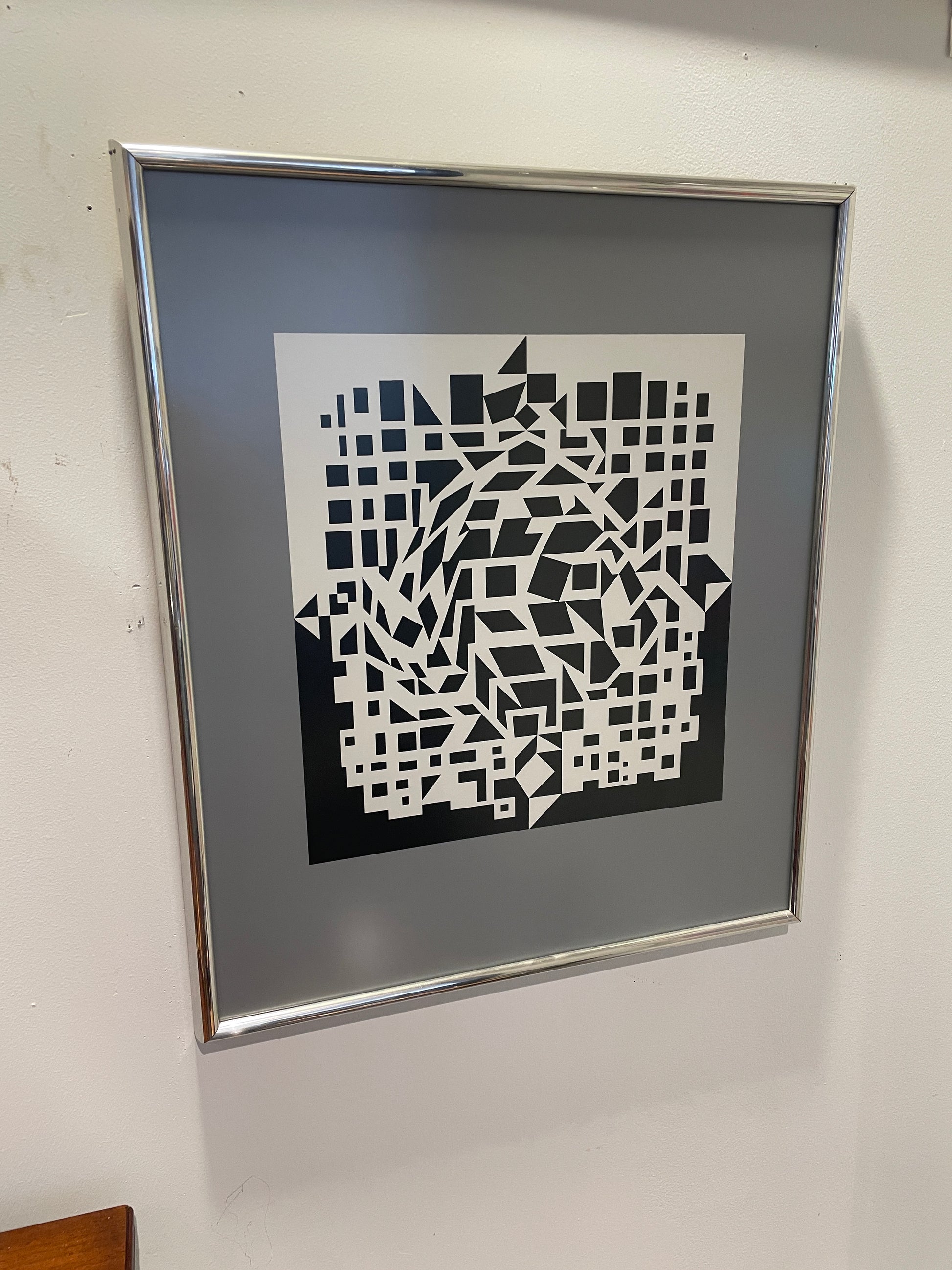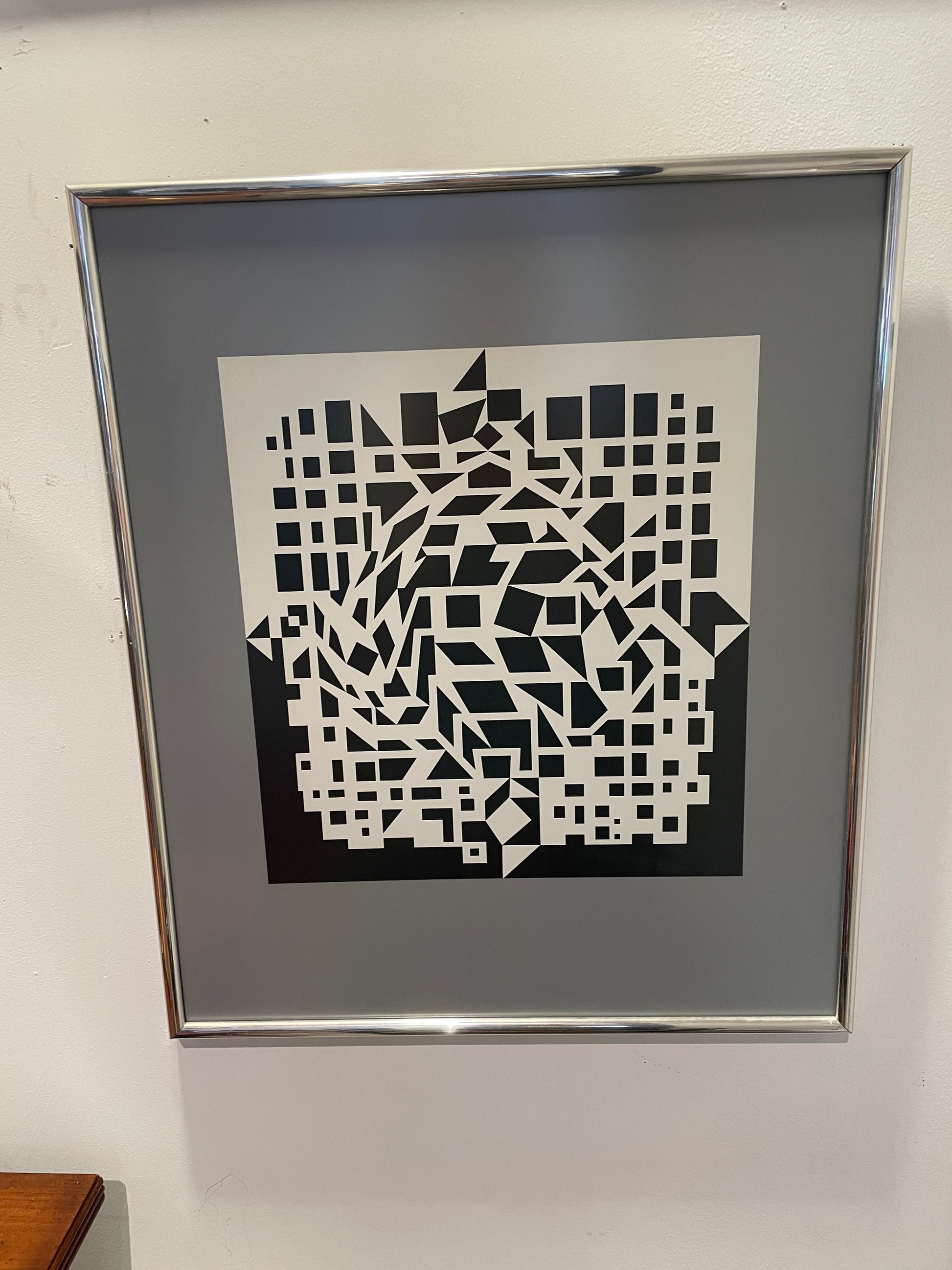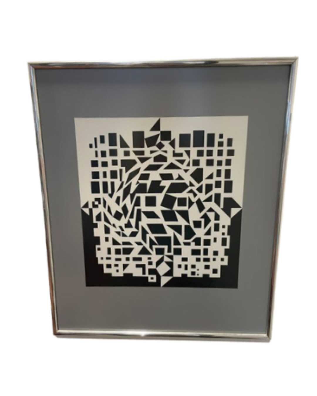Black and white framed op art style heliograve print titled "Citra et Ixion" by artist Victor Vasarelyl. Features a modern, geometric design that gathers to create a diamond and square. The piece is held in a silver, metal frame with dark gray matting.