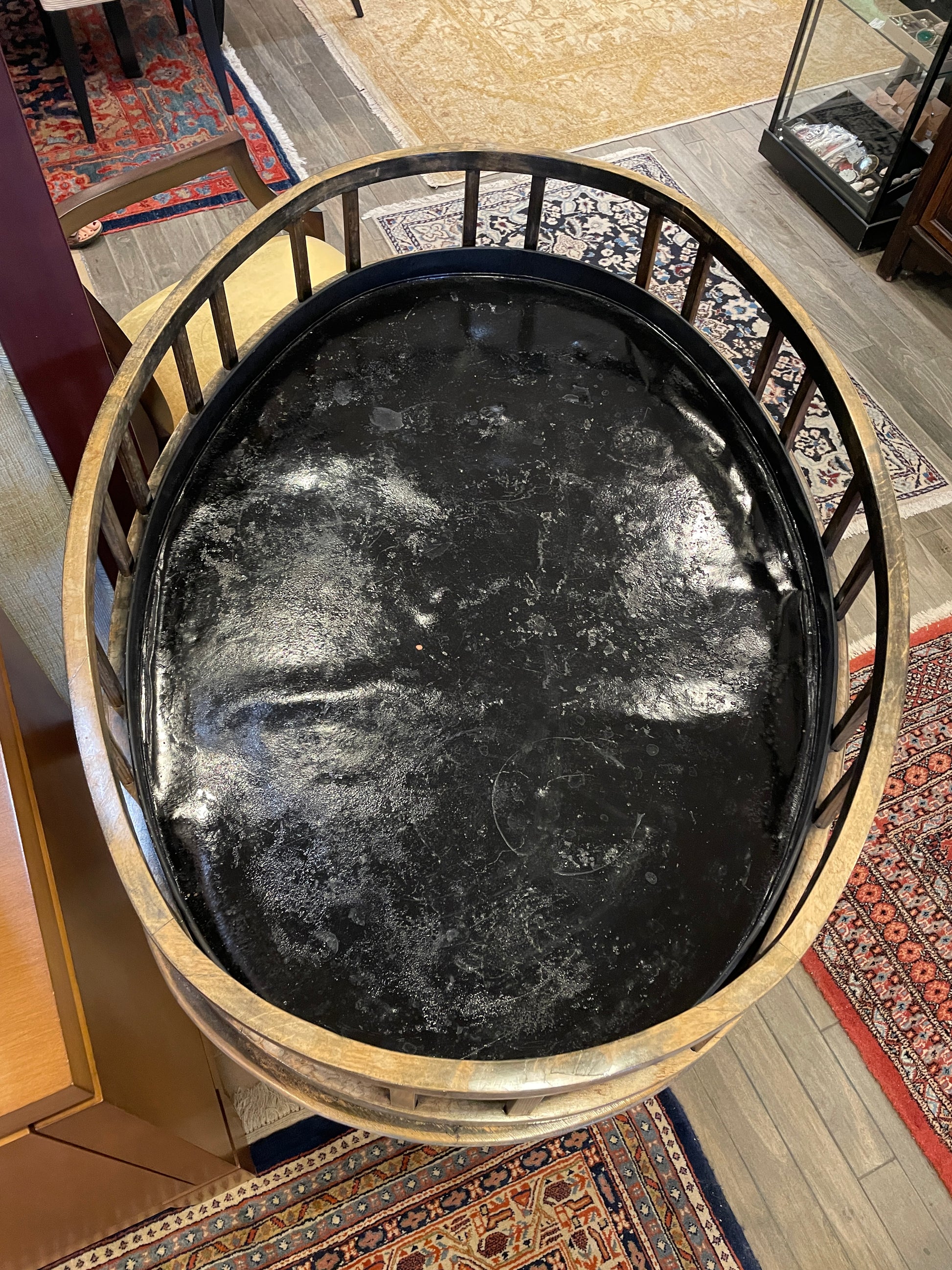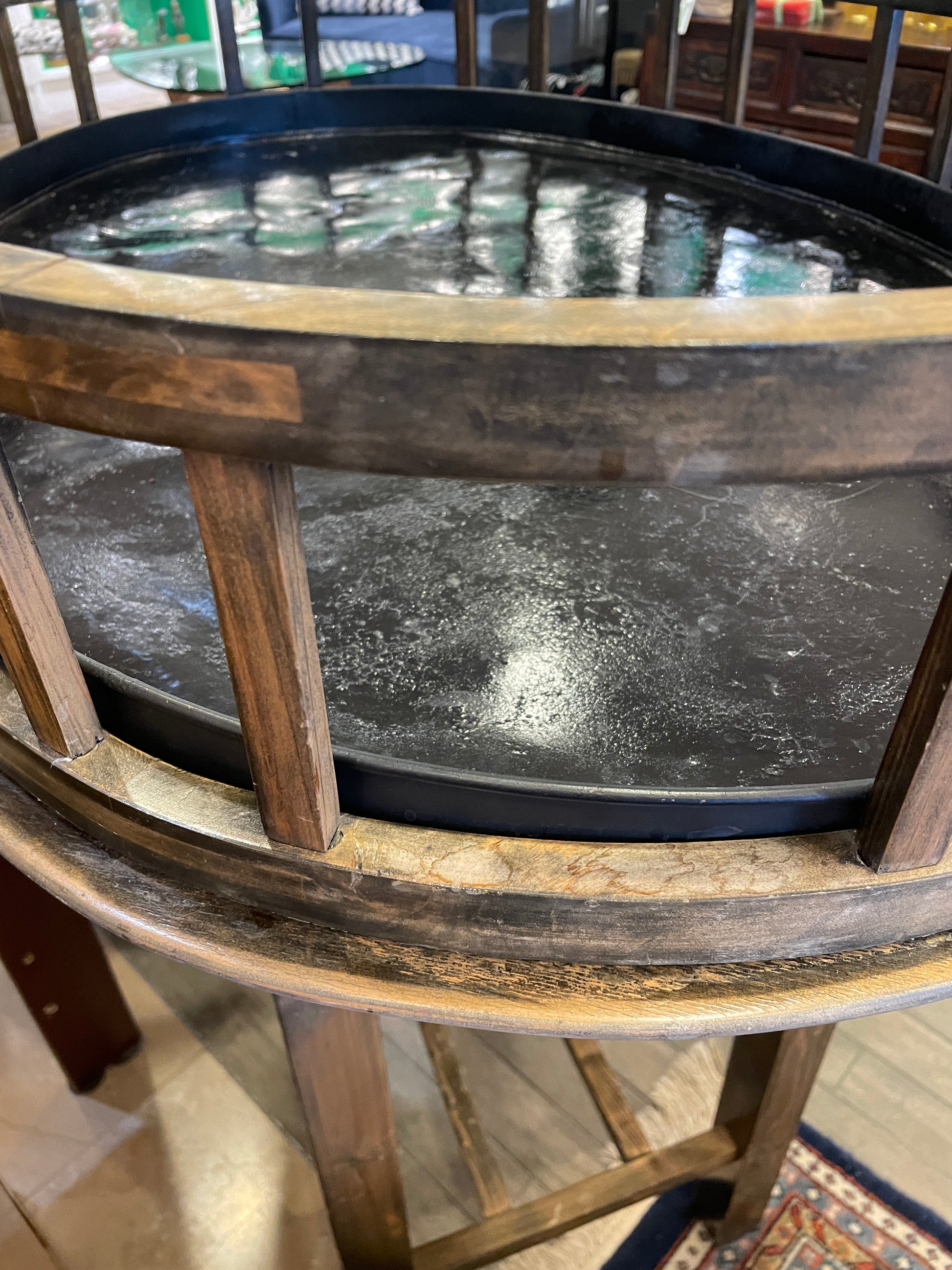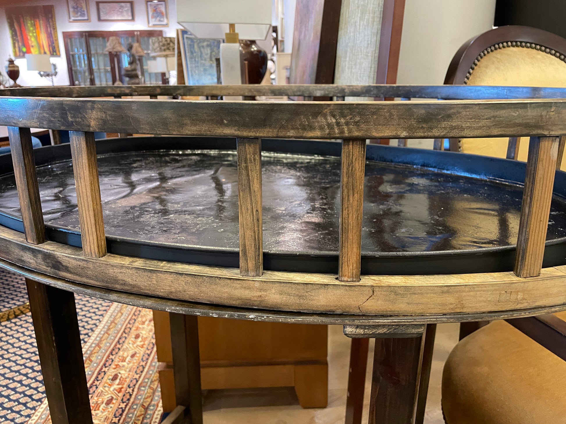 Vienna liquor stand/plant stand with insert. This beautiful antique piece sits atop four square wooden legs with a stretcher connecting them. The top has a black insert and is surrounded by a wooden gallery. The top is oblong in shape. The wood has a uniquely finished look thanks to the age of this piece. A beautiful piece of history that's sure to add an antique feel to a space.