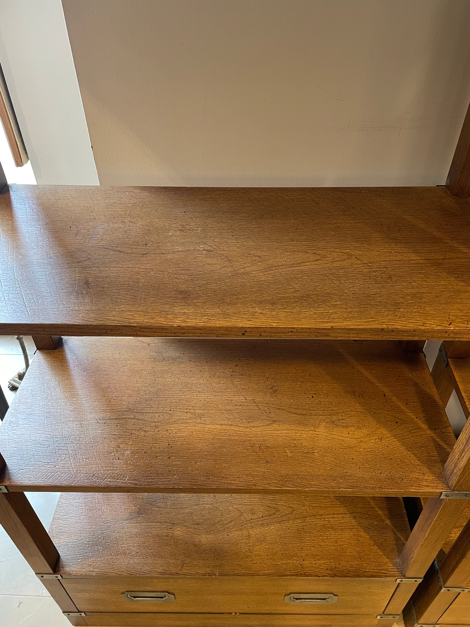 Kenmore vintage campaign style bookcase. This beautiful bookcase features a medium toned wooden frame with one drawer at its base. With five shelves on top of the drawer, this piece has loads of storage! Its simple and sleek open design makes it a versatile piece good for mixing and matching with other styles of furniture. The piece has small silver colored hardware accents on the corners where the shelves meet the frame, and the handles that sit flush with the drawer are silver colored as well. A beautiful wooden piece that is sure to elevate a space with its simple elegance.
