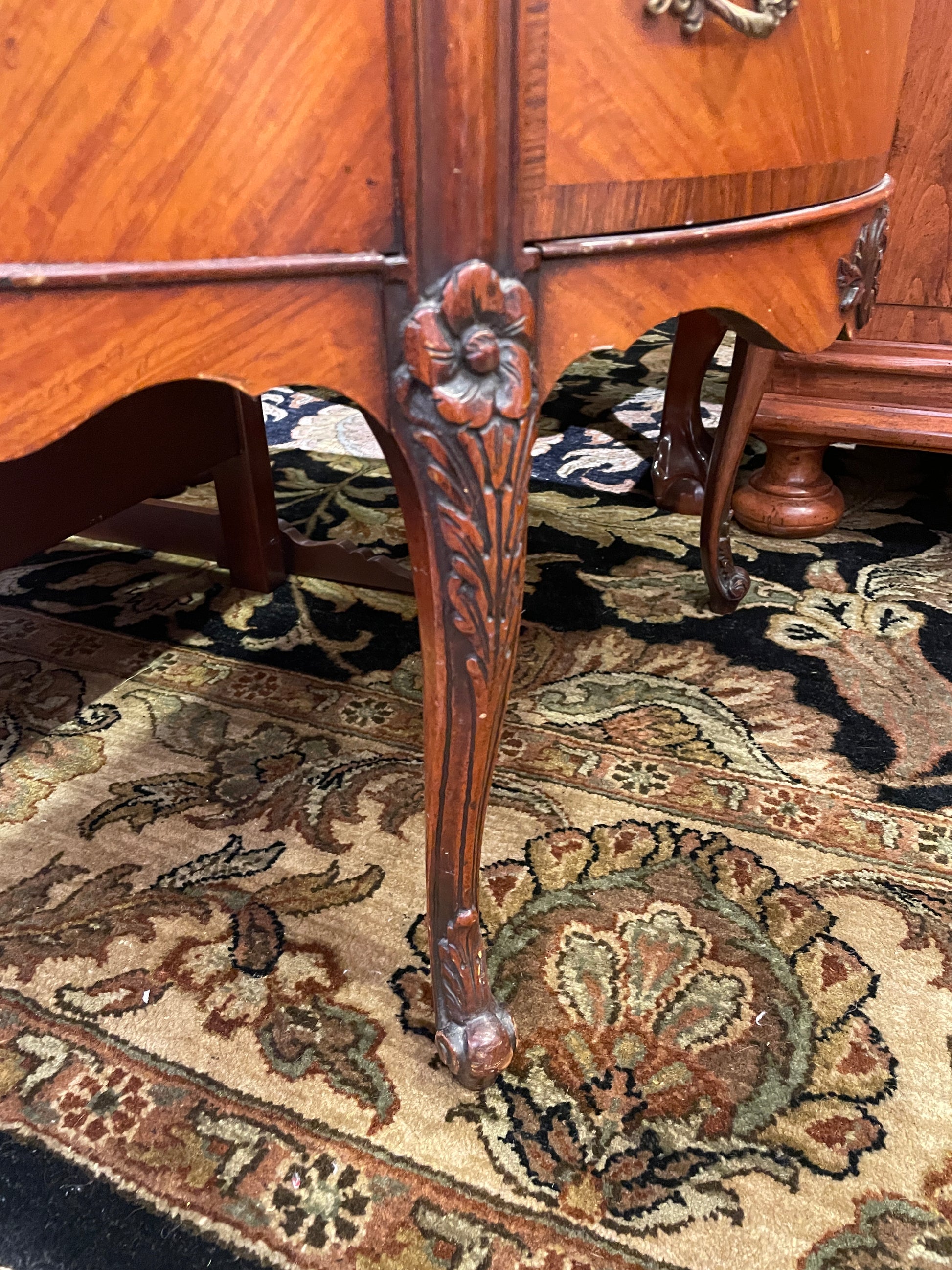 Vintage French demilune chest with ormolu. This beautiful wooden piece features three drawers, each of which has two beautiful downturned brass handles with abstract details. The piece sits atop thin cabriole legs with scroll feet. The piece has intricate ormolu designs that include florals, and two distinct wood tones give this piece beautiful contrast. Intricate carved floral designs also adorn this piece. A stunning piece that is sure to elevate any space with a French flare.