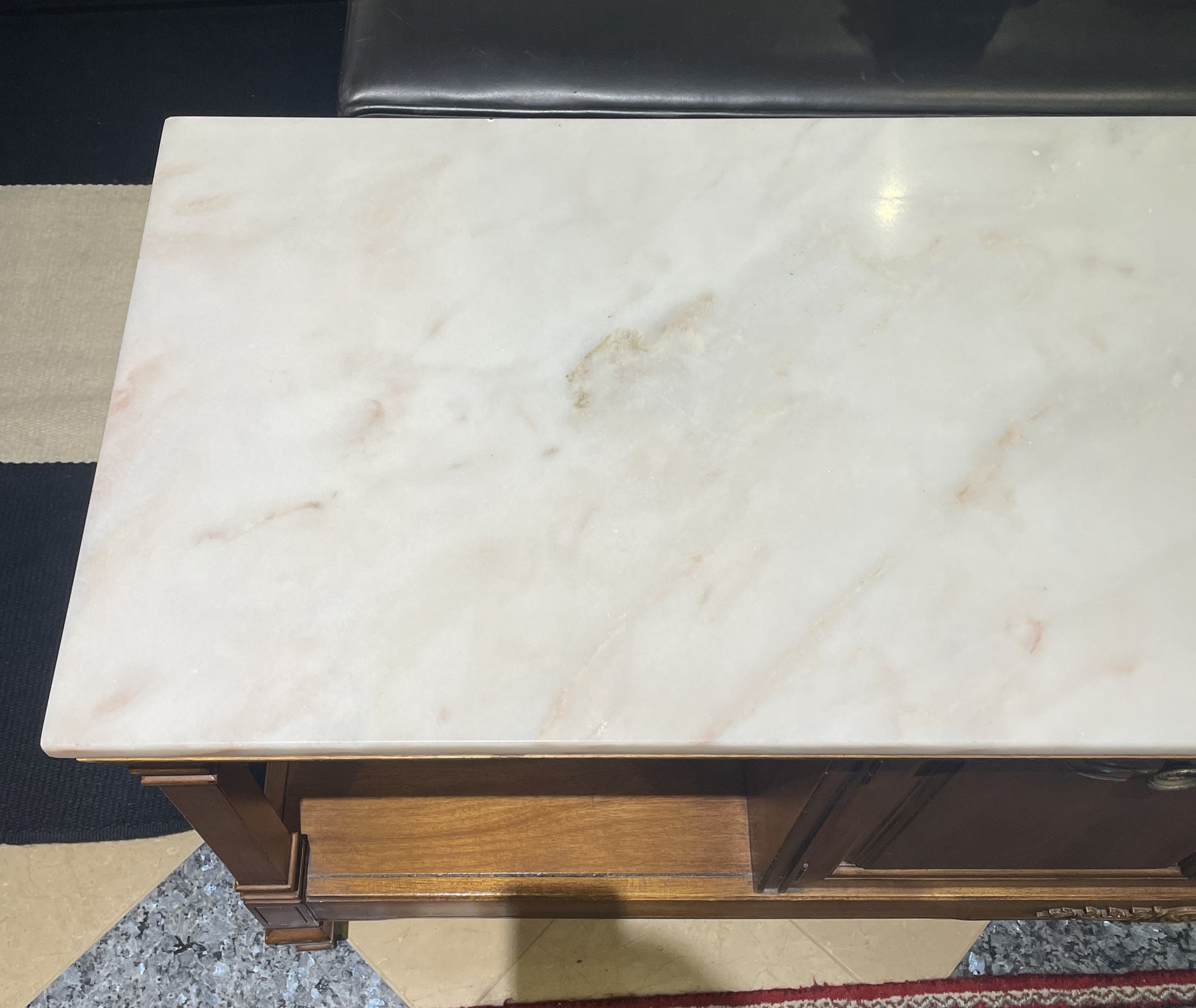 Vintage marble top console. This gorgeous console features a white marble top that sits on a medium toned wooden base. The base sits on four legs with simple carved details. The base also includes a convenient storage compartment enclosed by two doors with little brass knobs for easy opening. There is an open space on either side of the storage compartment that can be used to display items. Just below the storage compartment is a carved detail that includes leaves and a flower. The marble tabletop is almost completely white with subtle veining in a light rose shade. A beautiful console with both functional and visual appeal.