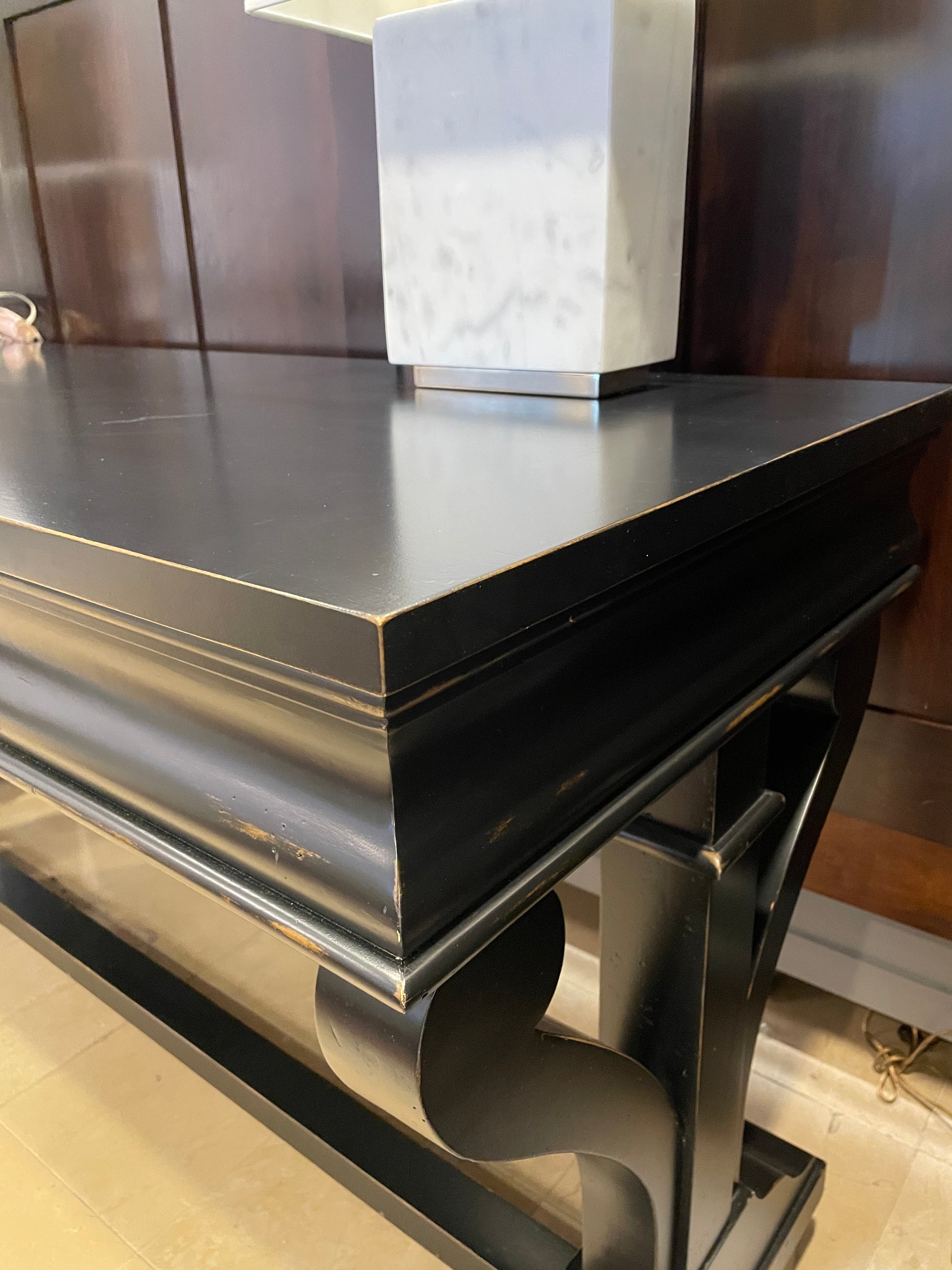Walter E Smith black console table. This wooden table has a beveled frieze, uniquely shaped legs and features an H-stretcher. The two legs on either side of the table are hourglass shaped - thickest at the top and bottom with a thinner section in the middle. The tops of the legs feature scroll details as well and the bottoms of the legs sit atop block feet. This simple yet elegant table is a great addition to a space.