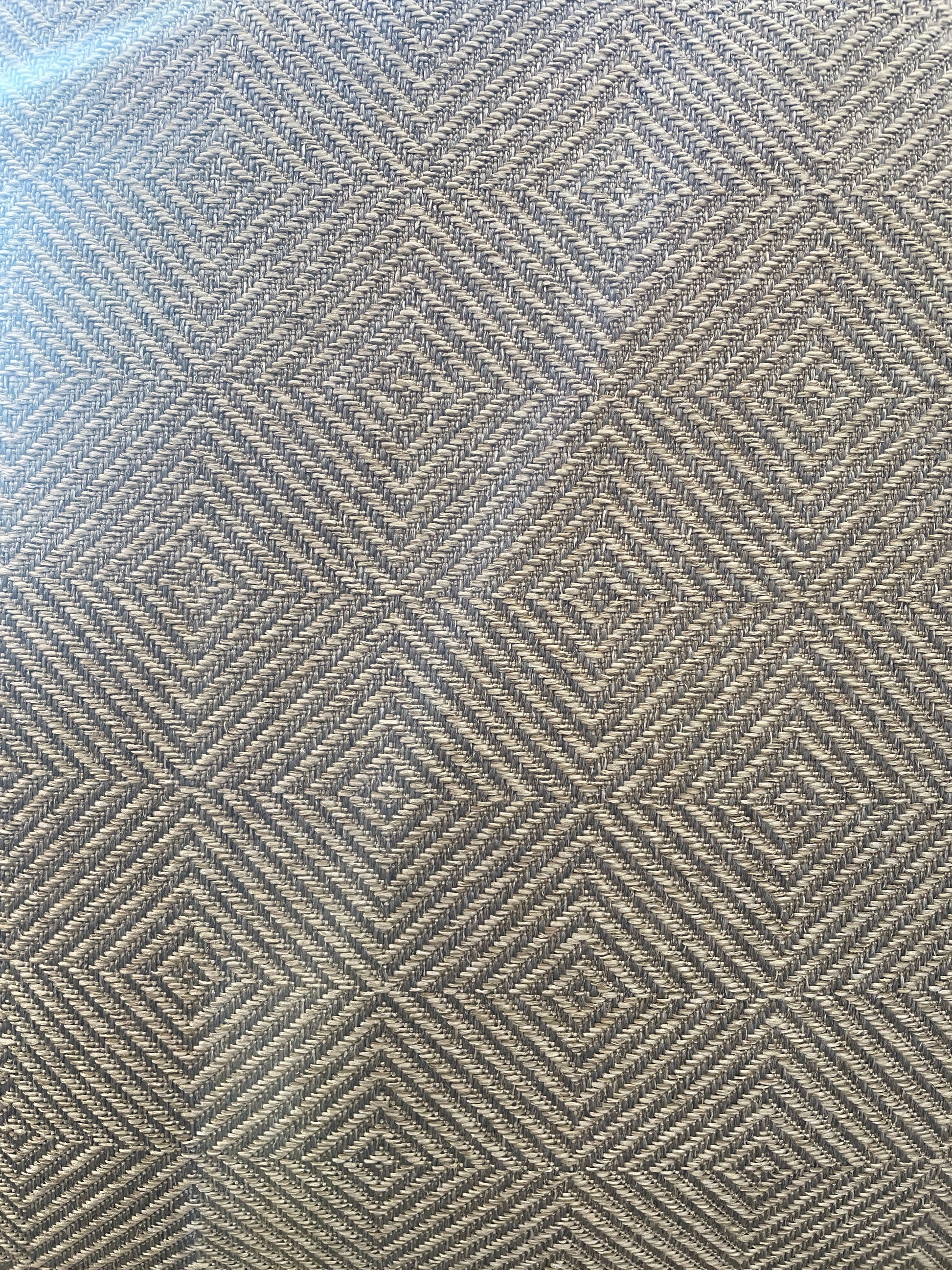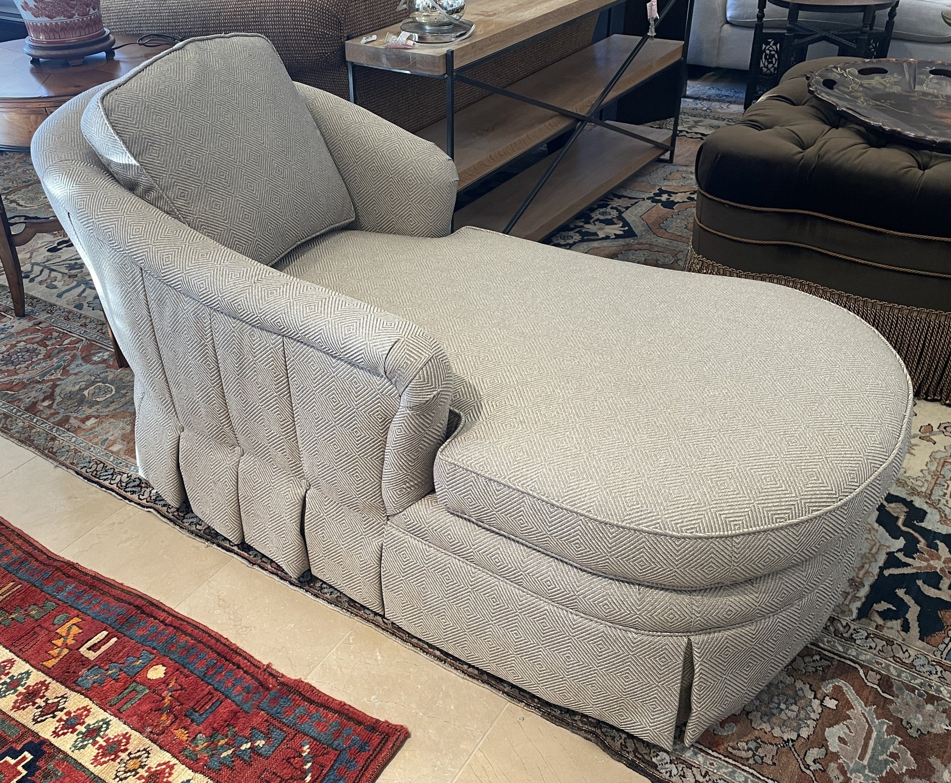 Walter E Smithe "Brewer Dressmaker" chaise lounge. This charming chaise features a comfortable and chic gray diamond patterned fabric. The chaise has an overall rounded shape with one long arm on the right side and one short arm on the left. The arms are connected to form a back that hugs the top of the piece. The chaise includes a back and seat cushion. The exterior of the piece features a skirted design with pleats that lead up the sides of the arms and back. The pleated details are accented by subtle buttons upholstered with the same fabric that covers the rest of the chair. This charming chaise is a perfect way to add comfort and contemporary flair to a space.