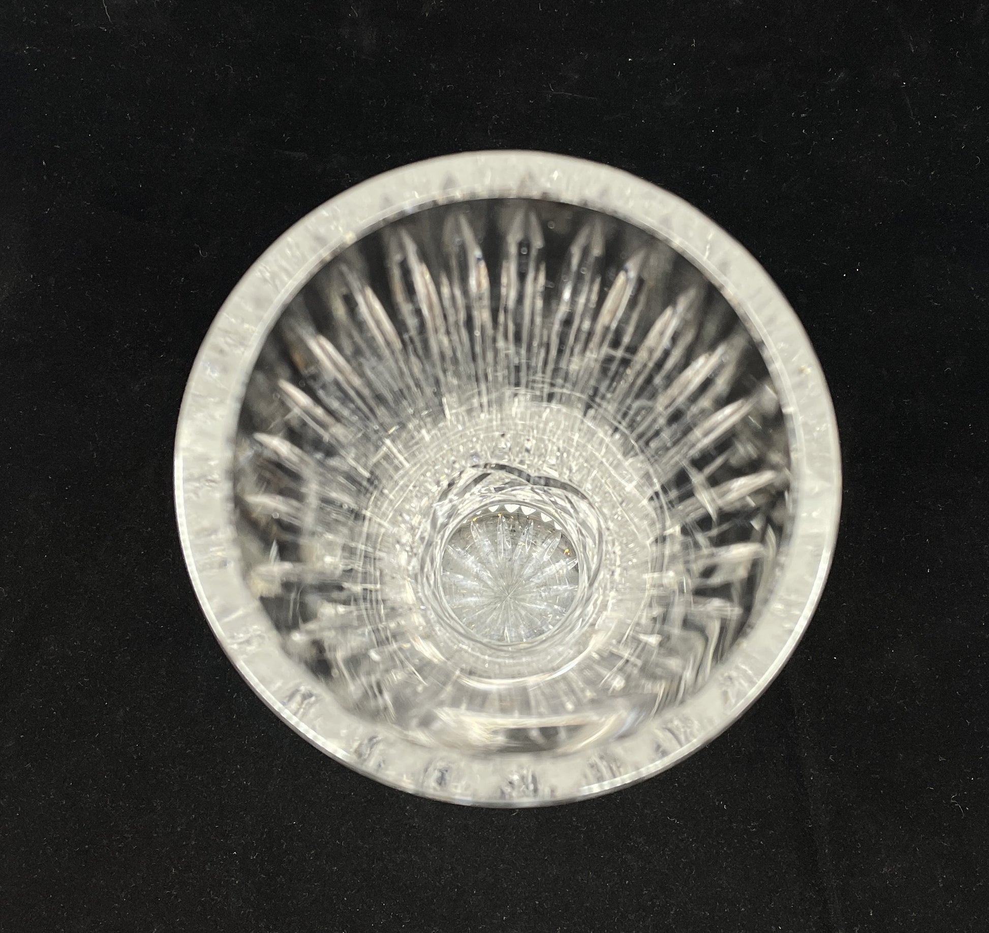 Waterford 10" flower vase. This elegant vase is beautifully crafted with cut glass details that sparkle in the light. The vase has an hourglass-like shape with a wide base, narrow center, and broad mouth. The lower portion of the vase has a crisscross pattern, and the neck has many vertical lines details. A gorgeous and elegant way to elevate an arrangement of flowers.