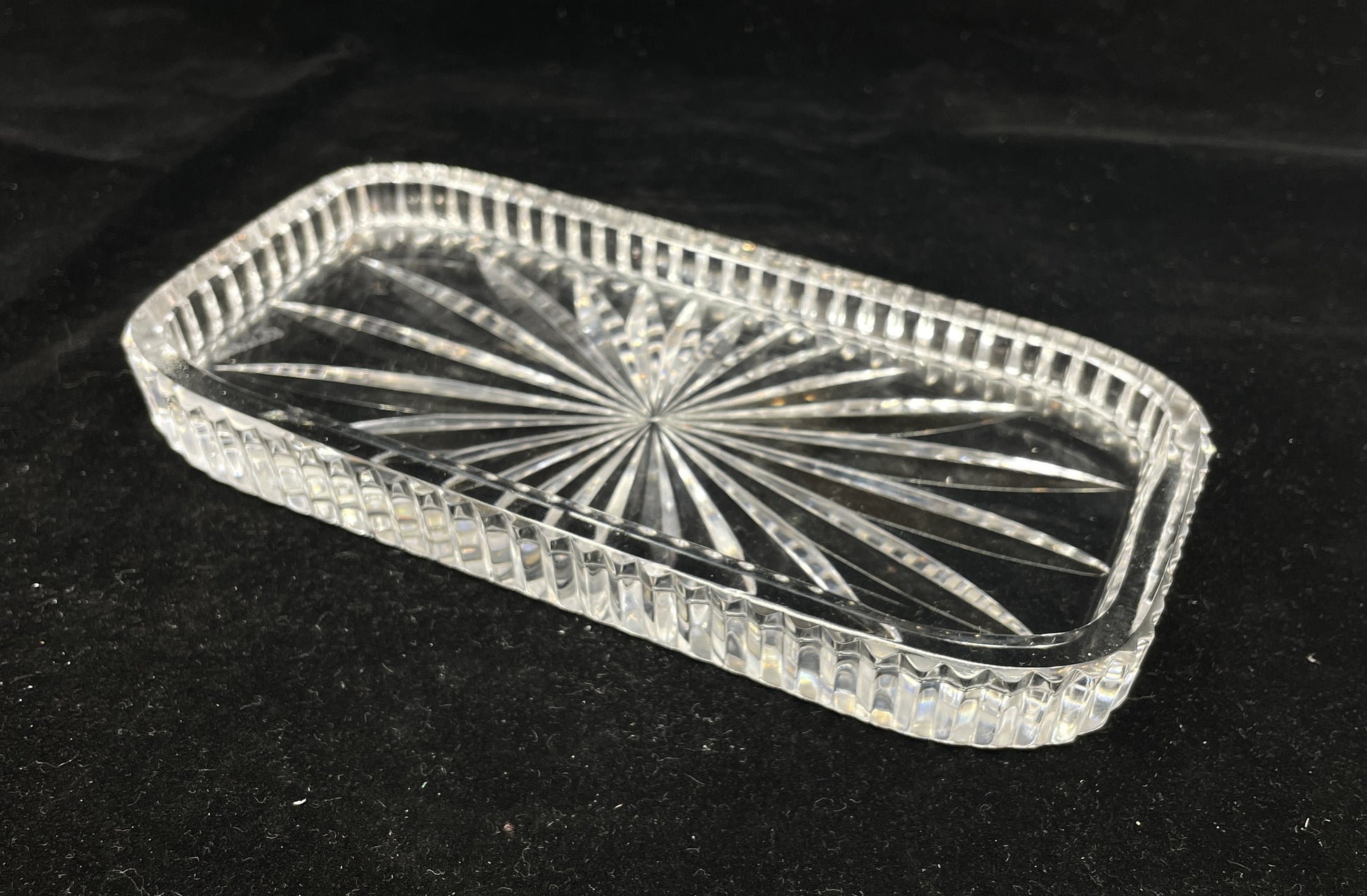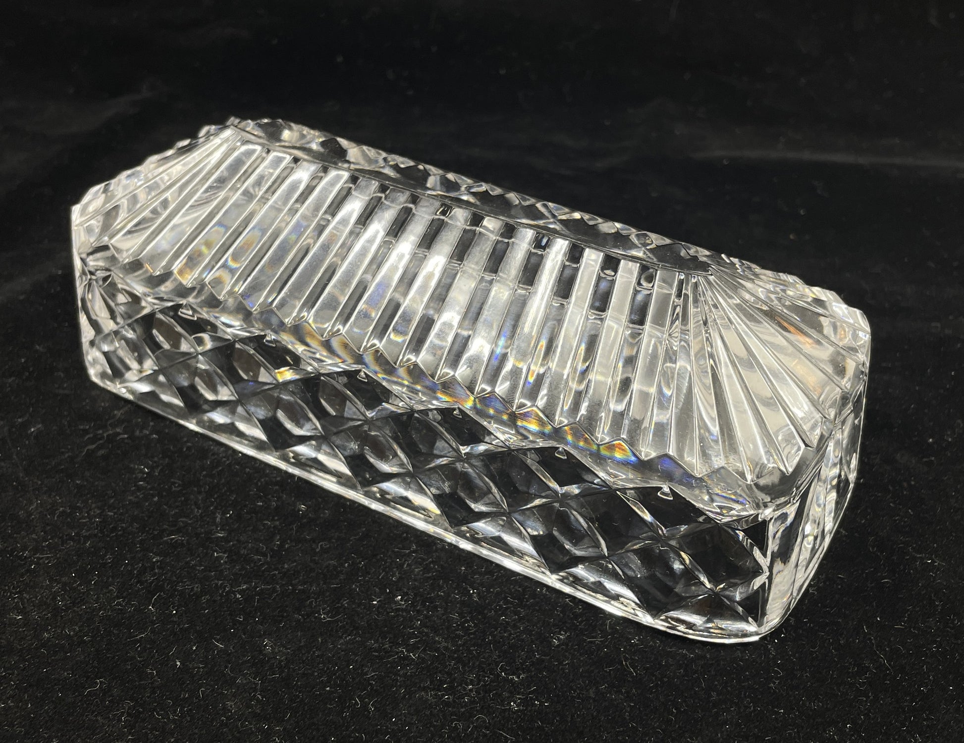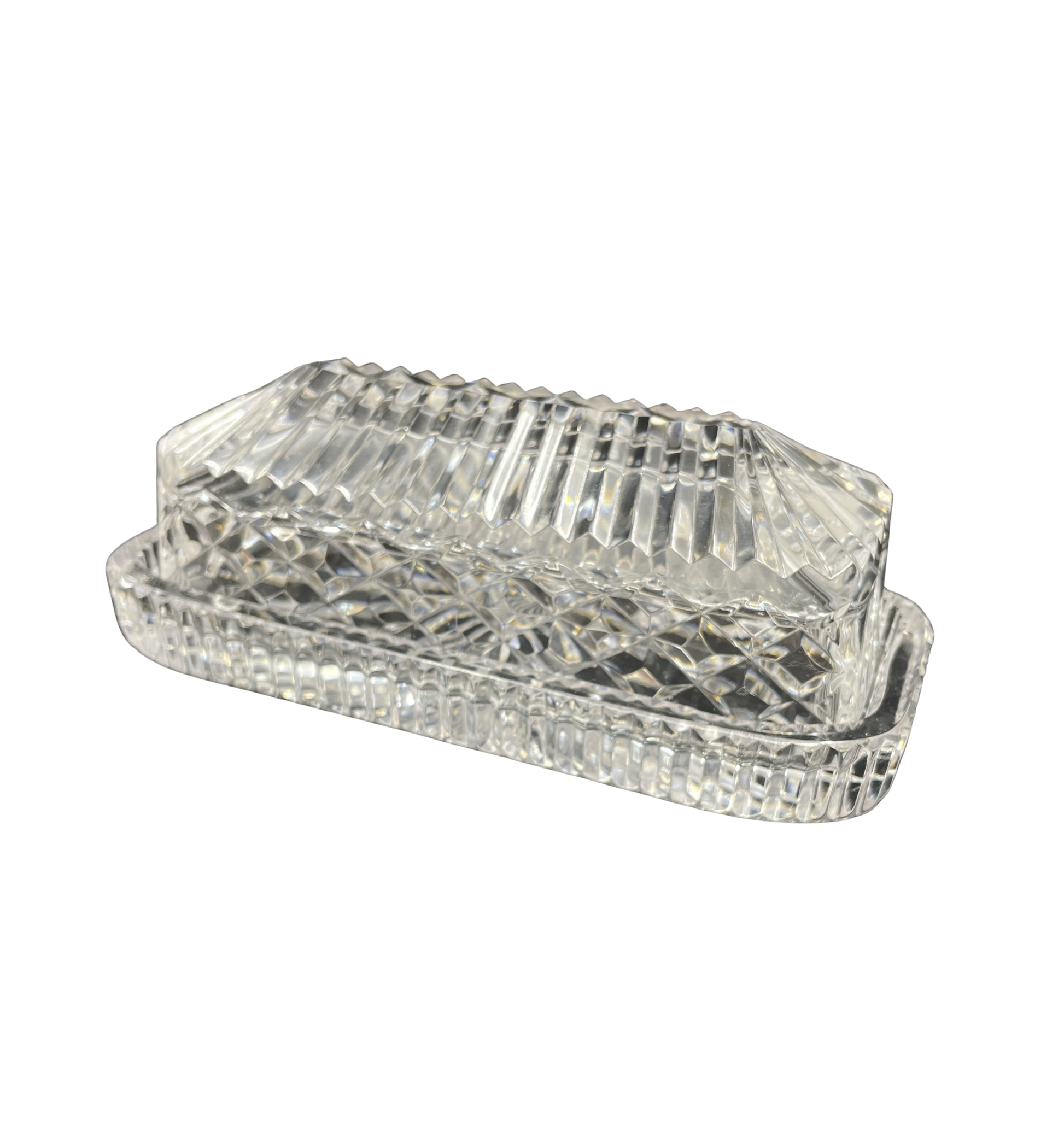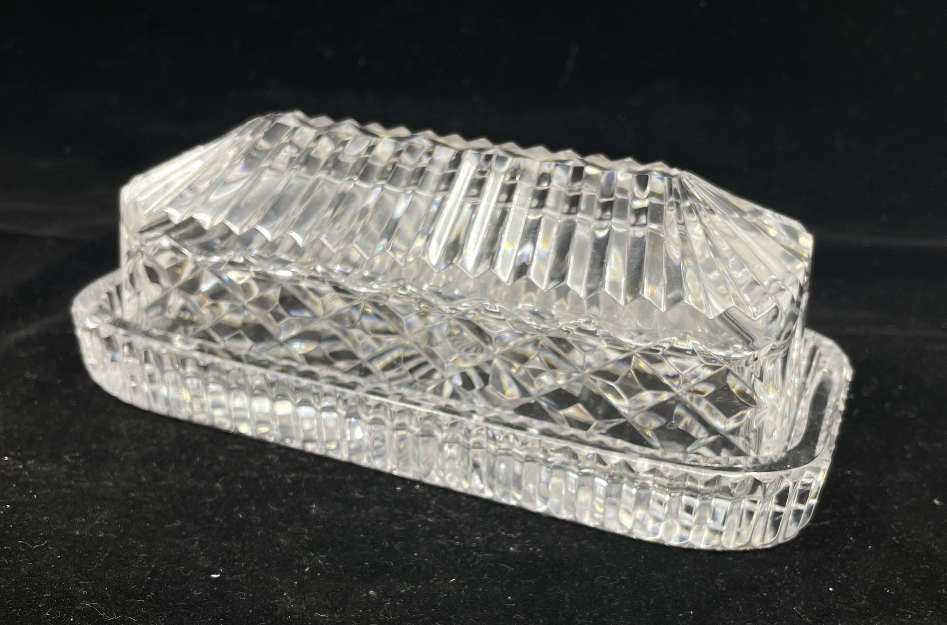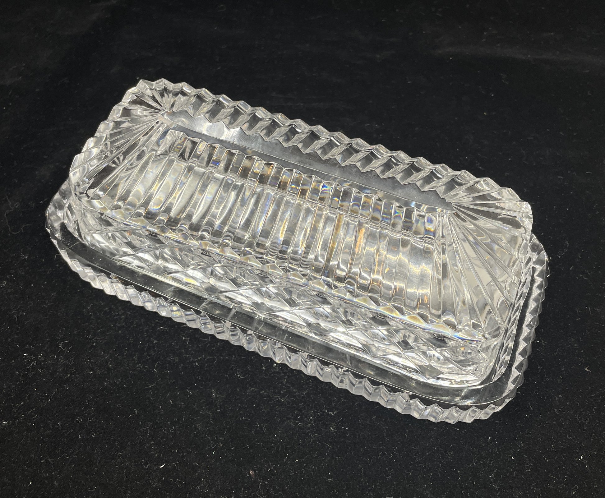 Waterford butter dish. This beautiful dish has a cut glass base and cover. The base has a star-like design. The cover has intricate cut glass details consisting of straight lines that intersect or sit parallel to each other. A beautiful piece full of detail that's sure to elevate a setting.