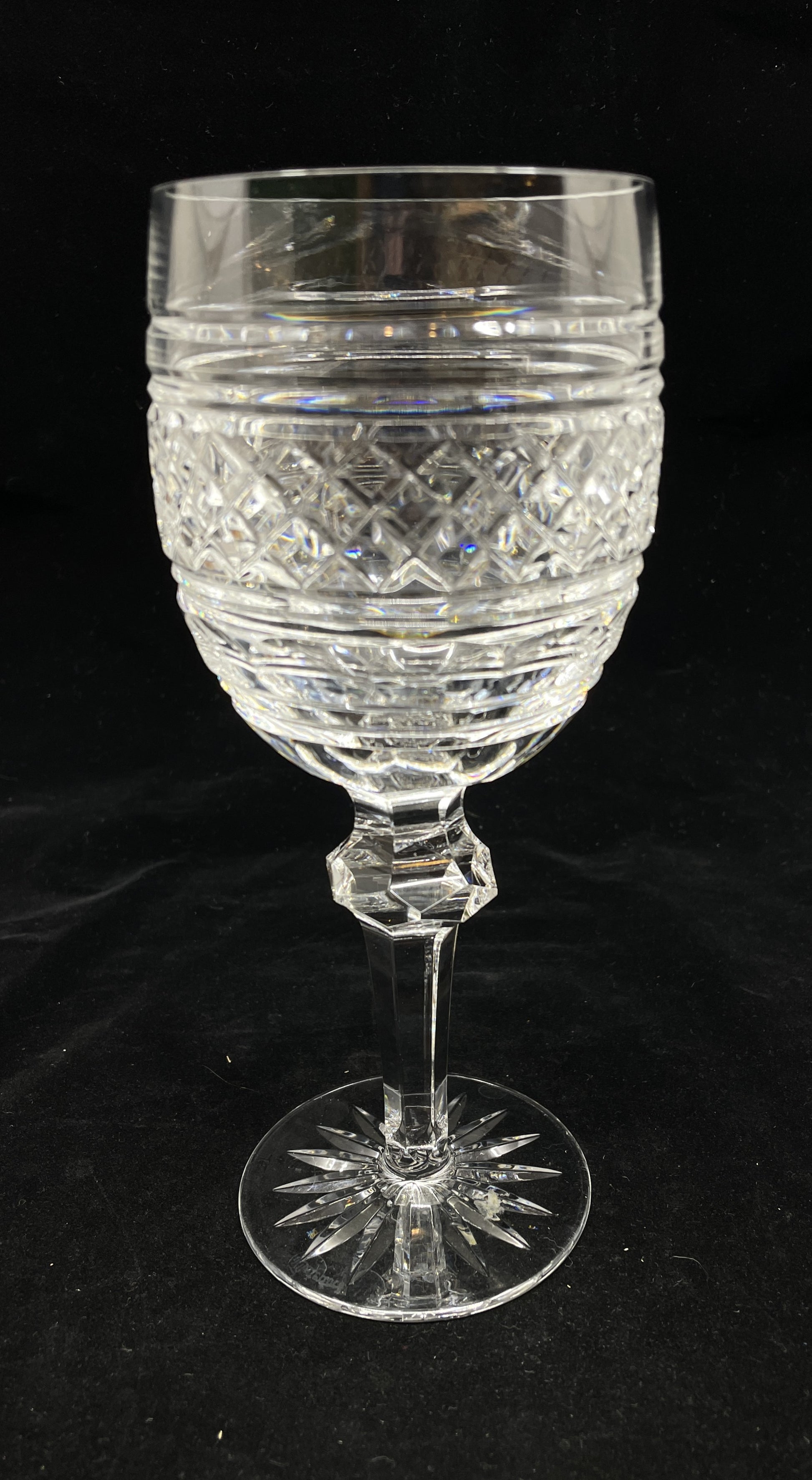Waterford Castletown water glass. Beautifully cut crystal glassware that sparkles as it catches the light. With a multifaceted stem that is topped with a small gem-shaped detail and a bowl ornamented by an intricate crisscross design, this glass is sure to elevate a space with luxury charm.