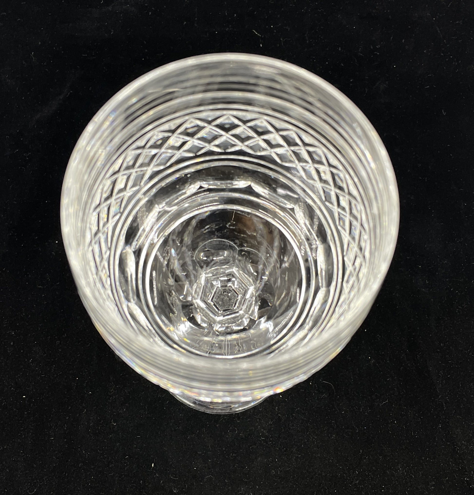 Waterford Castletown water glass. Beautifully cut crystal glassware that sparkles as it catches the light. With a multifaceted stem that is topped with a small gem-shaped detail and a bowl ornamented by an intricate crisscross design, this glass is sure to elevate a space with luxury charm.