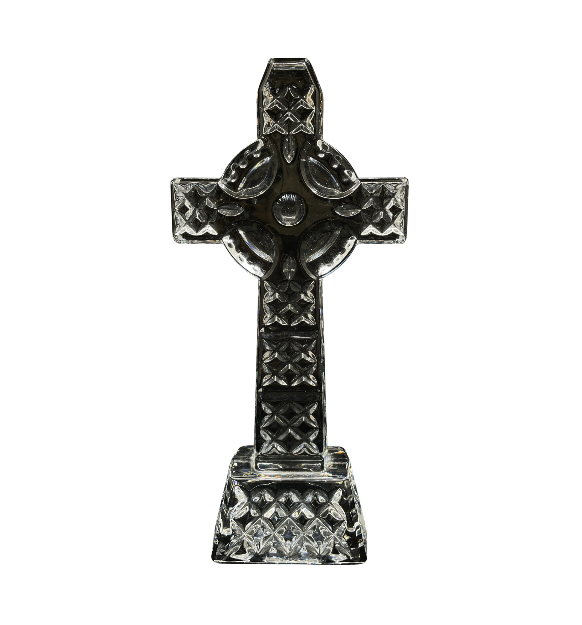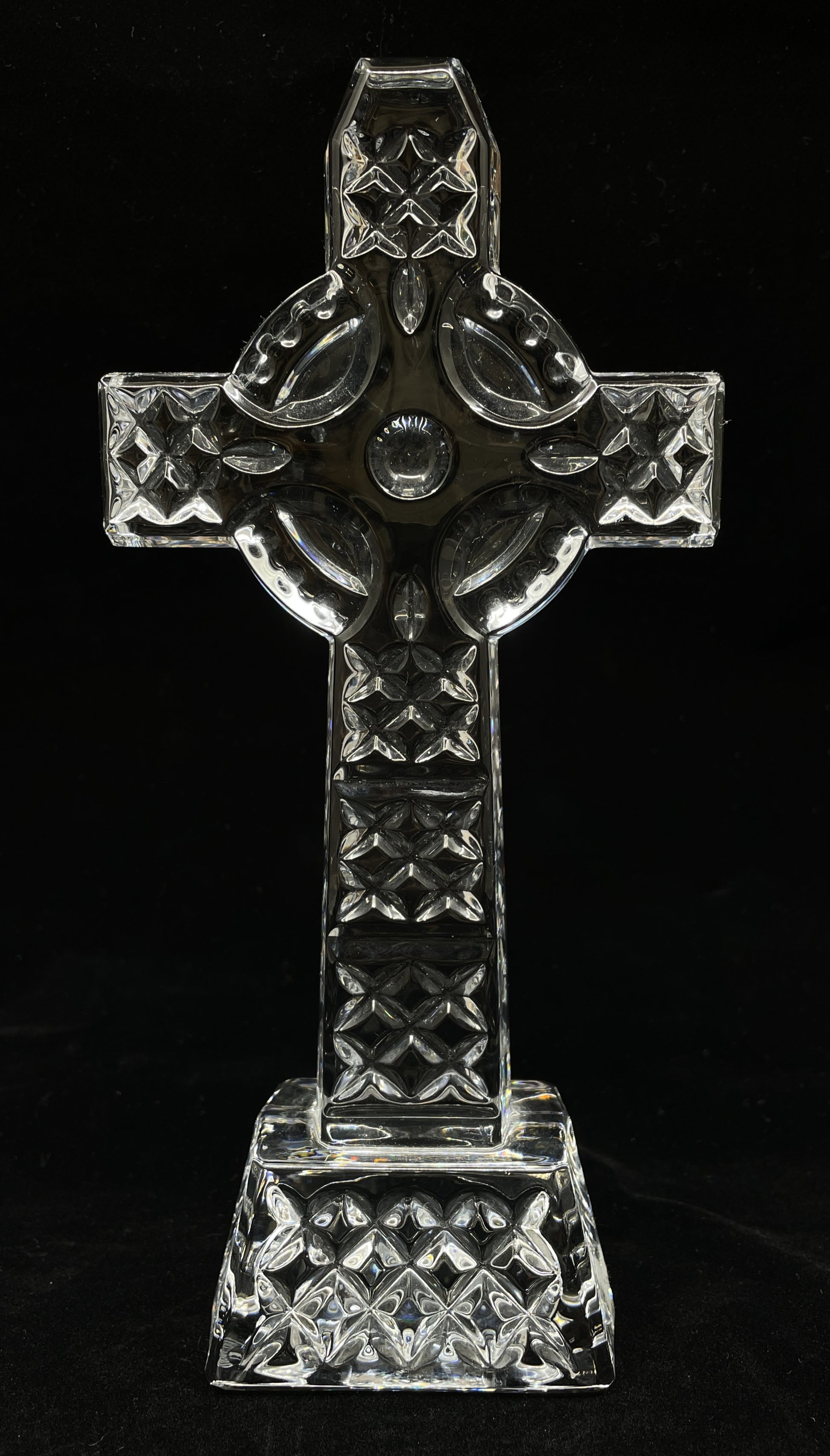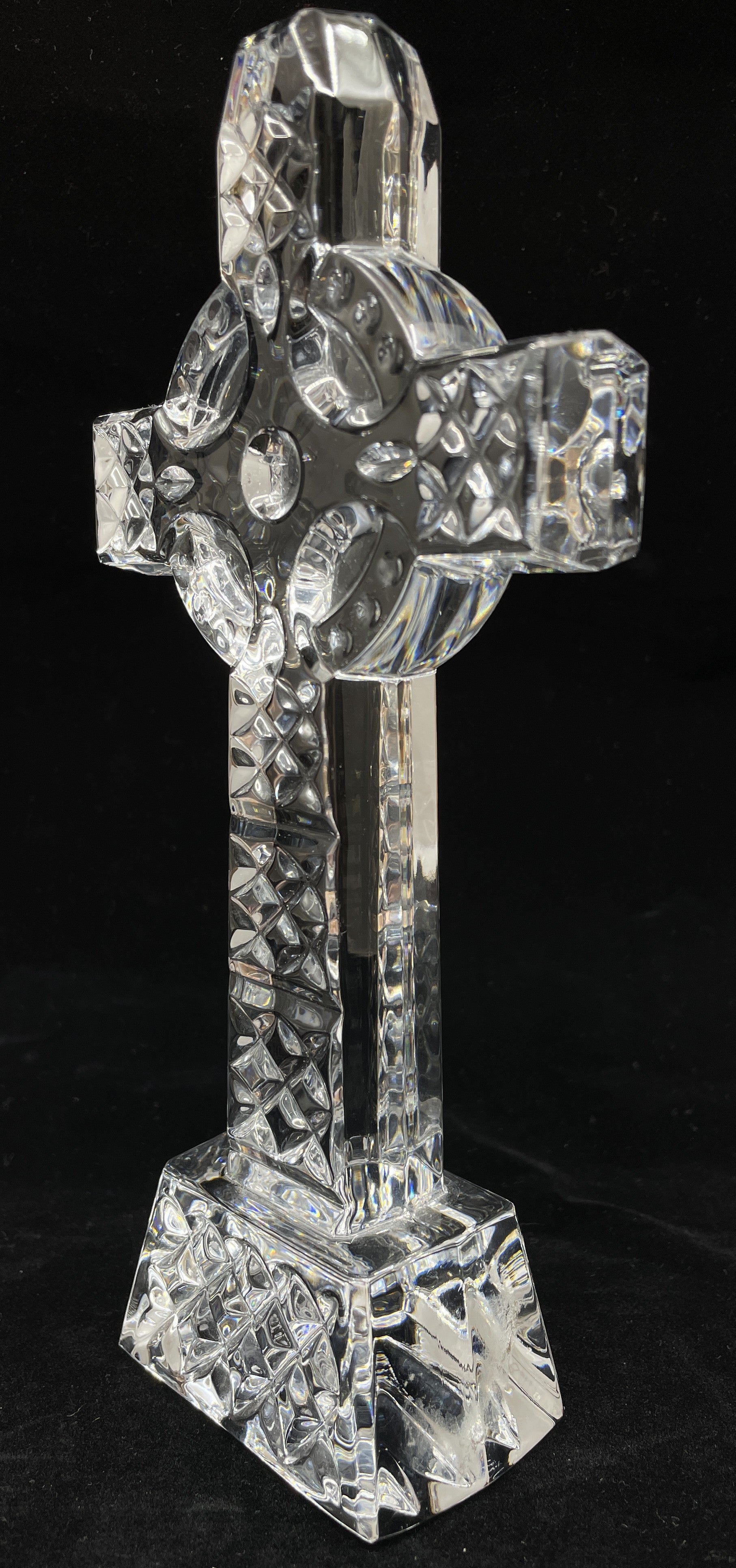 Waterford Celtic cross. This beautiful piece depicts a cross covered in beautiful cut crystal designs. Notably, the majority of the details feature a crisscross pattern. The cross sits on a small trapezoidal pedestal. A beautiful collector's piece that is sure to elevate a space.