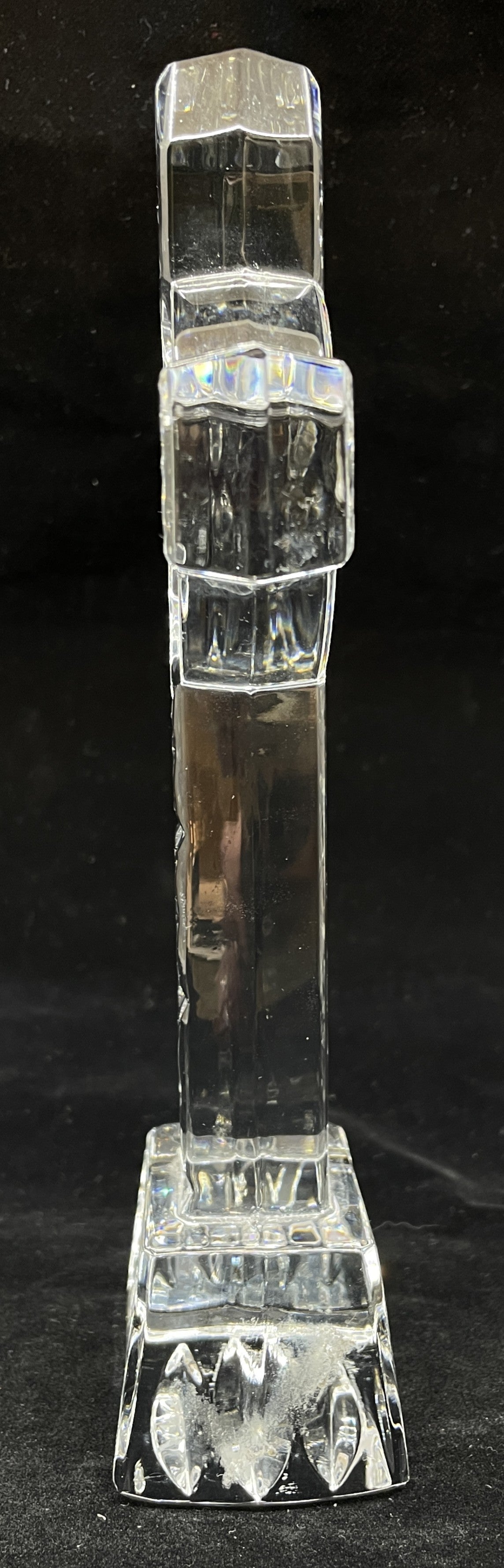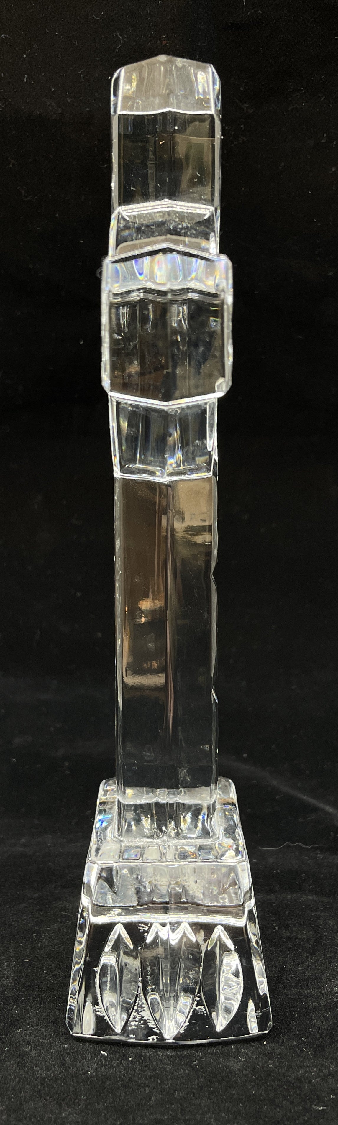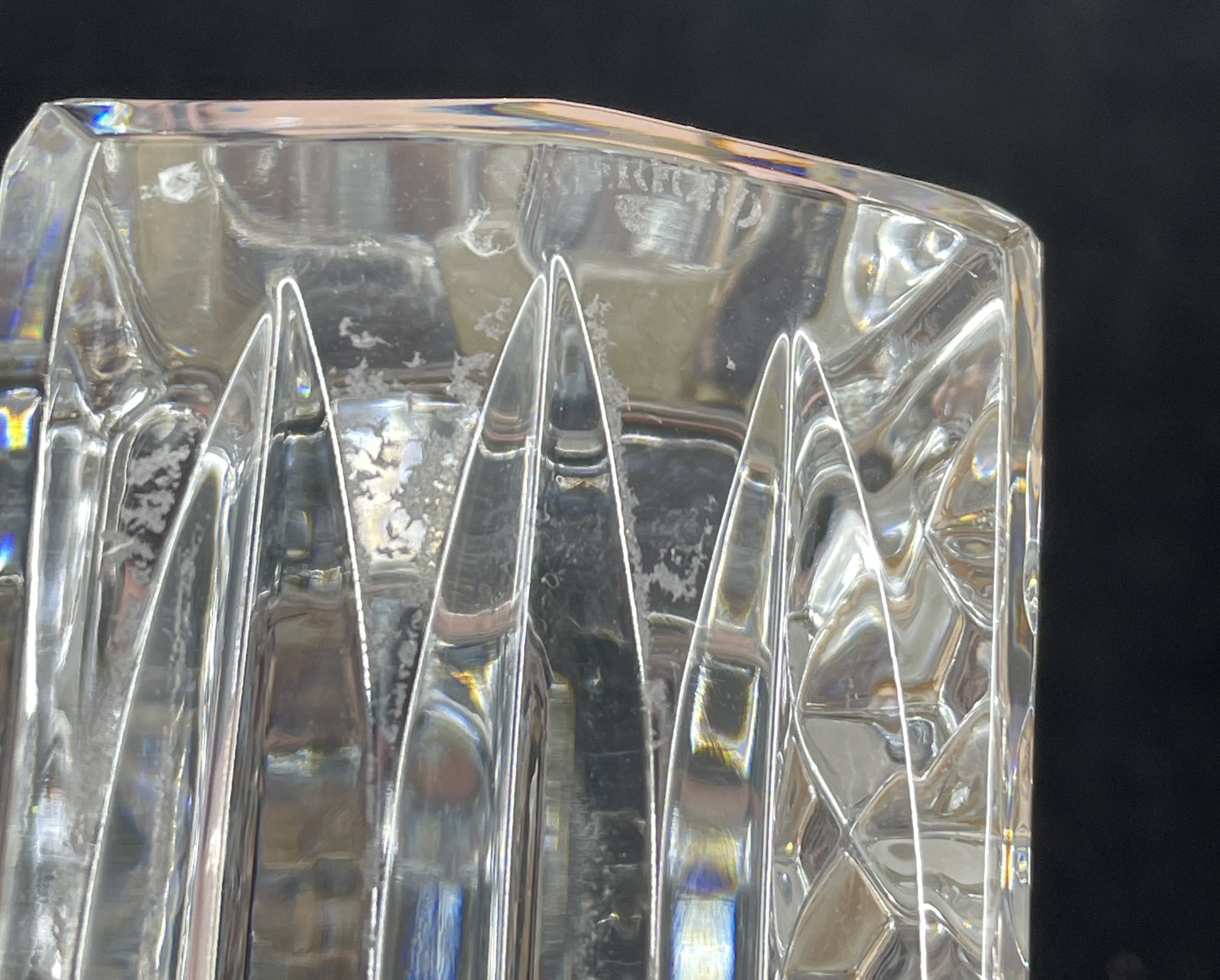 Waterford Celtic cross. This beautiful piece depicts a cross covered in beautiful cut crystal designs. Notably, the majority of the details feature a crisscross pattern. The cross sits on a small trapezoidal pedestal. A beautiful collector's piece that is sure to elevate a space.