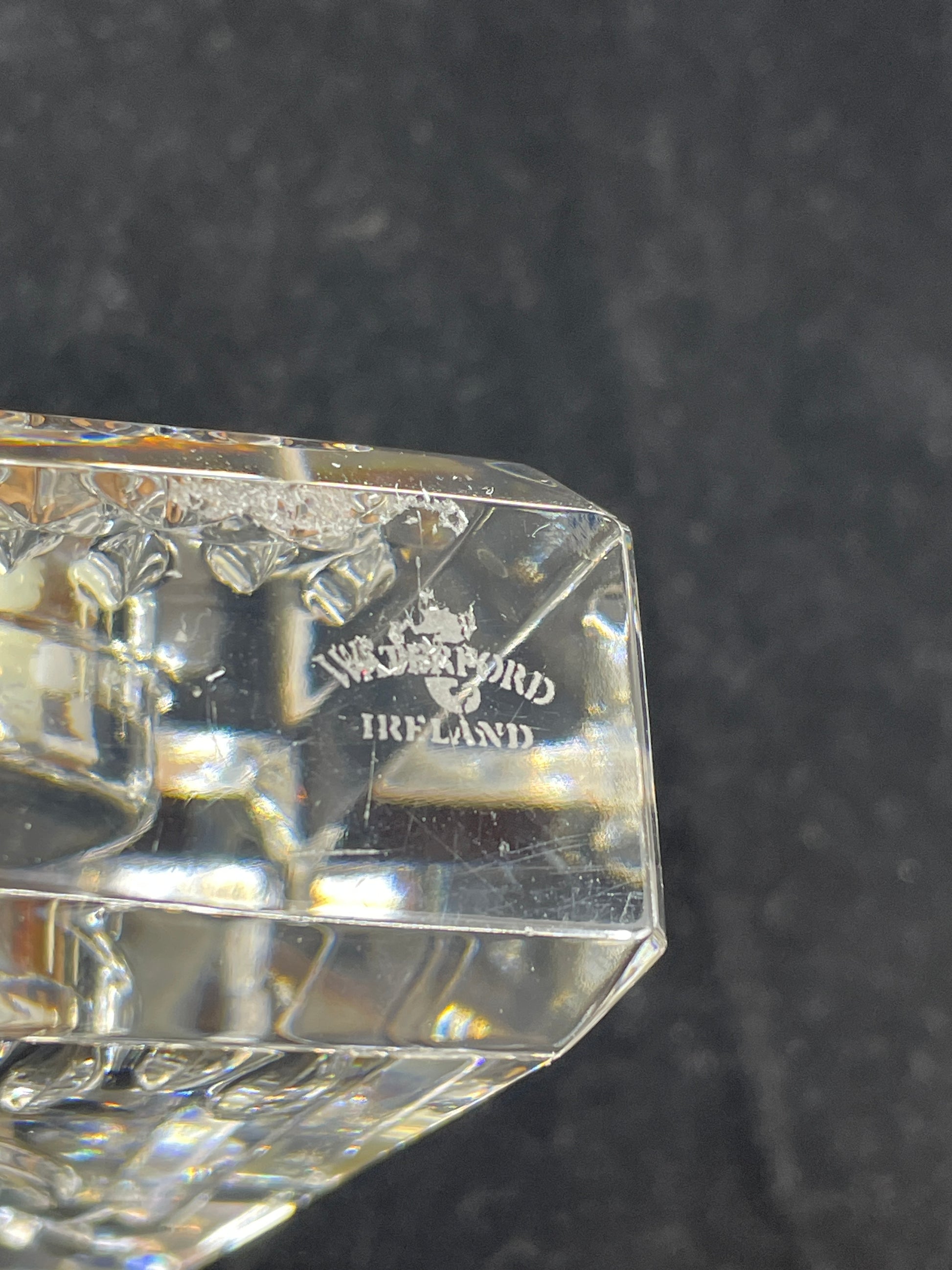 Waterford desk clock. This elegant battery powered clock has a rectangular crystal stand with cut glass designs. The clock face is white with black roman numeral markings. The words "Waterford Crystal" are marked in the upper part of the center of the clock face. The clock is surrounded with a gold rim. The base of the clock is etched with the Waterford brand marking. A beautiful piece that is sure to elevate a space with a touch of luxury.