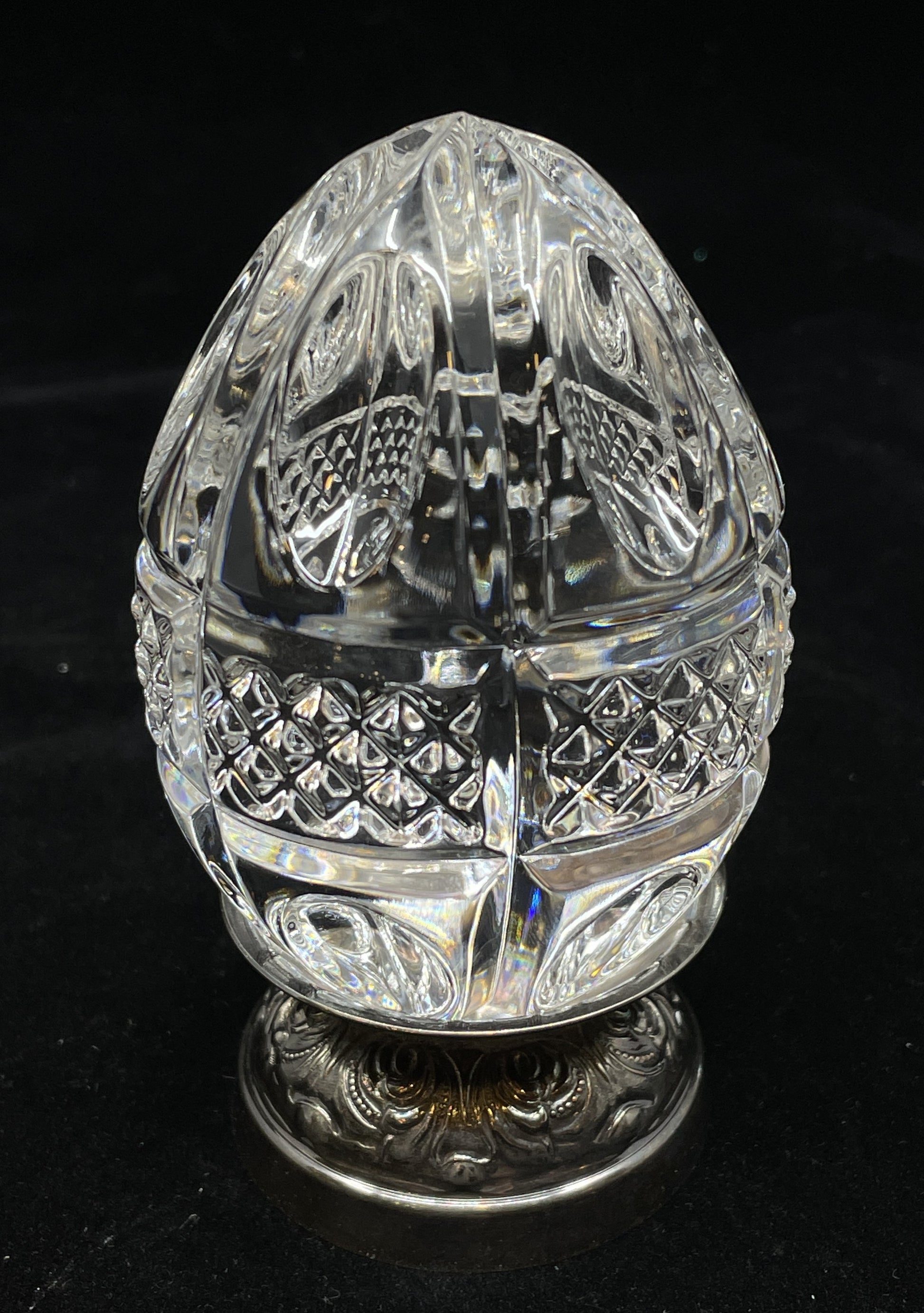Waterford egg 5th edition with box. This beautiful paperweight comes in two parts - a crystal egg and a silver plated stand. The egg features a beautiful cut glass design that reflects and refracts light beautifully giving it a stunning sparkle. The egg is divided into sections both vertically and horizontally, and the horizontal sections determine the pattern of each part. The top and bottom section have a large oval cut out in each vertical segment, and the center section has a crisscross pattern. The egg sits on a silver plated egg cup display stand with beautiful flourishing details. A gorgeous display piece that's sure to add a touch of luxury to any room.
