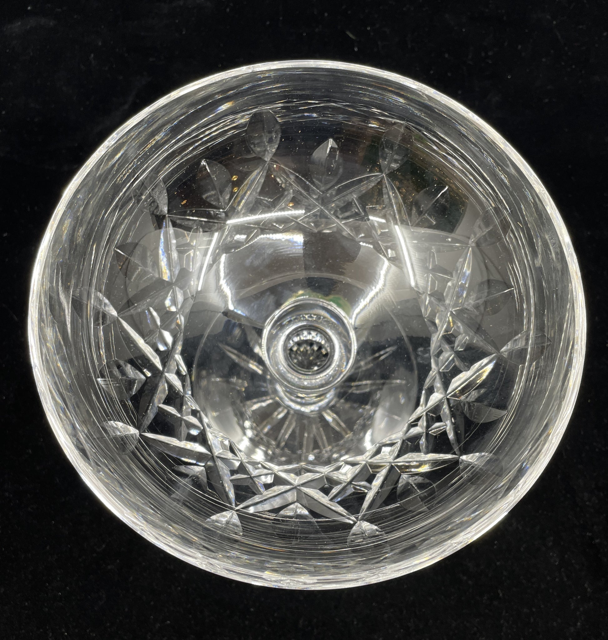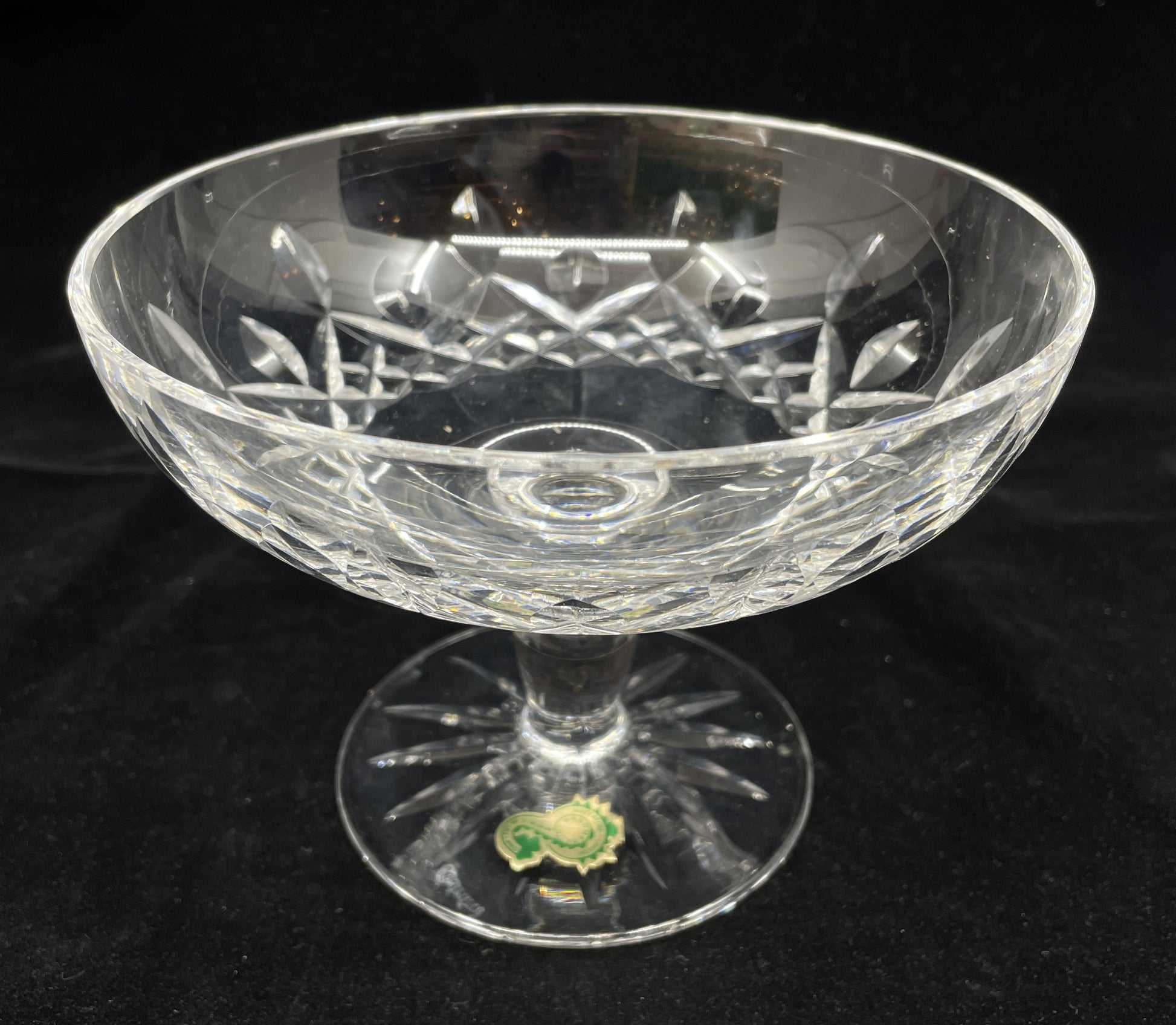 Waterford Lismore footed compote with box. Beautifully cut crystal glassware that sparkles as it catches the light. With a smooth stem and inviting shallow bowl, this glass is sure to elevate a space with luxury charm.