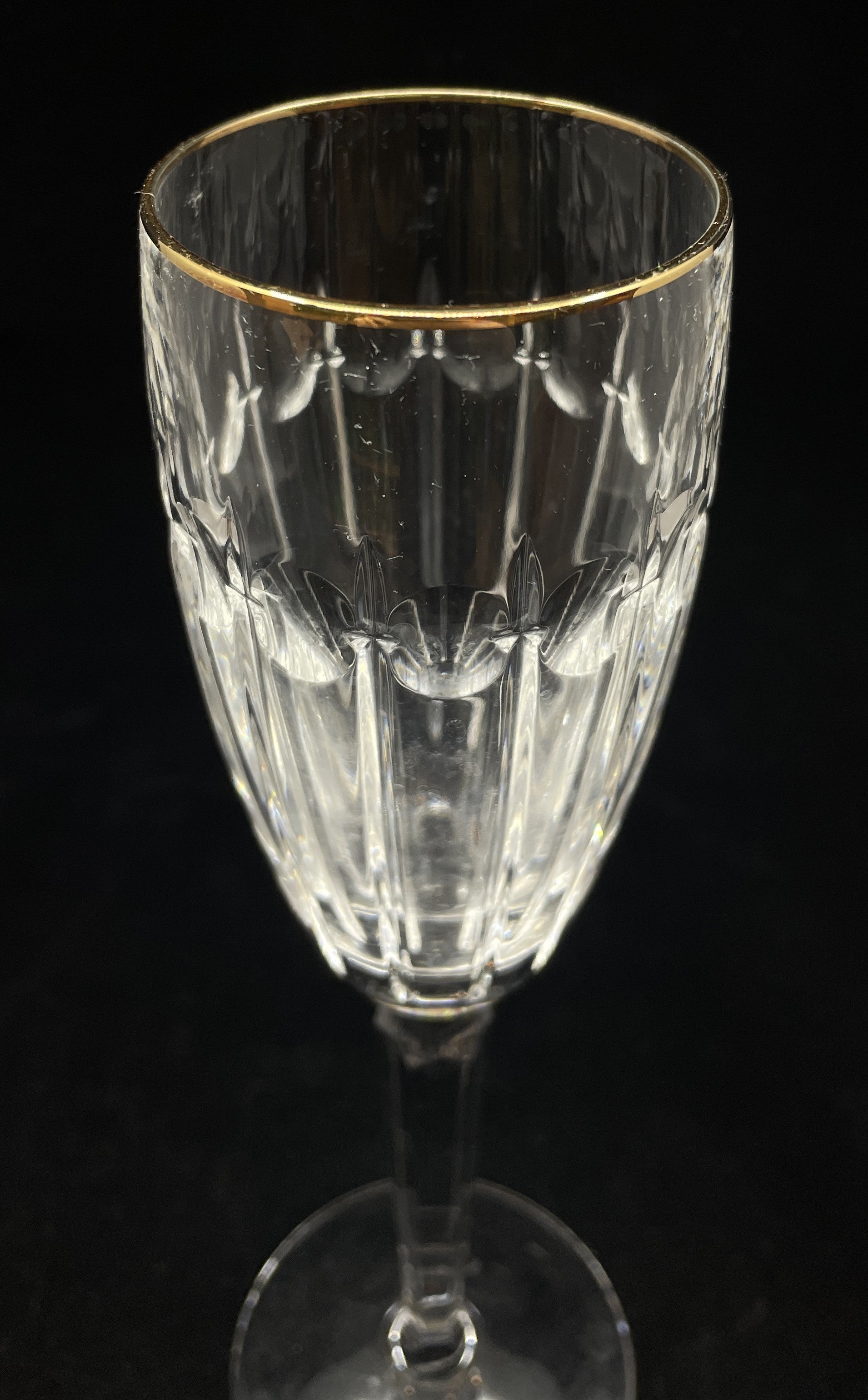 Waterford Grenville Gold champagne glass. This stunning glass features a subtle gold rim. The cut glass of the flute refracts light beautifully. The multisided stem and plain foot pair perfectly allowing the flute to hold the spotlight.