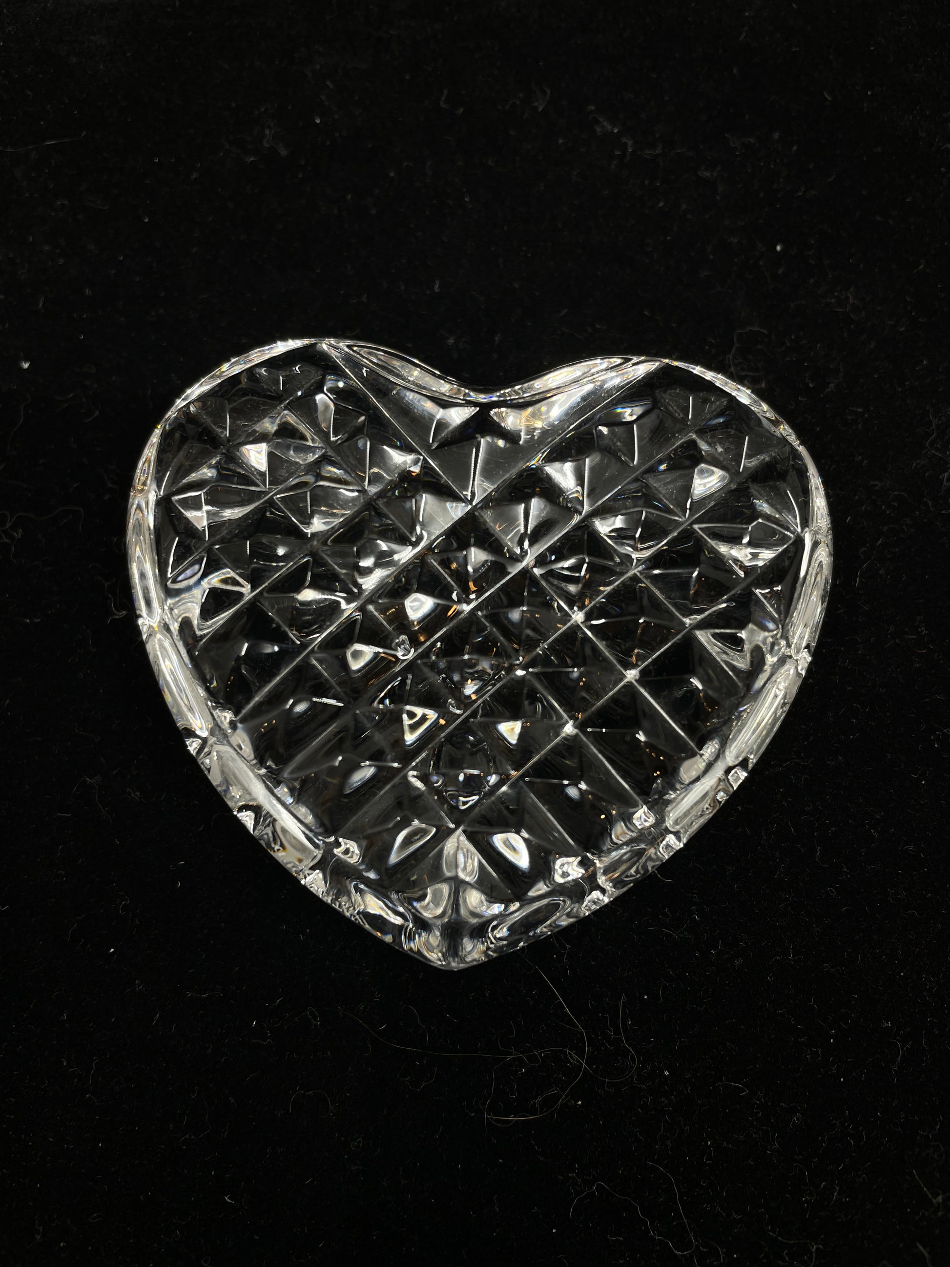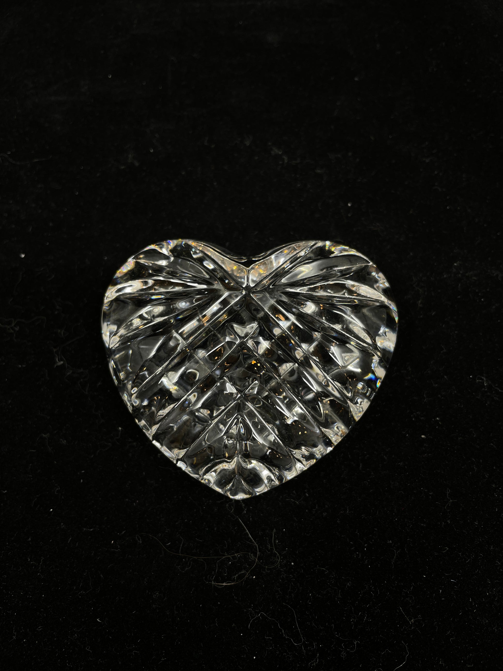 Waterford heart paperweight with box. This beautiful crystal glass paperweight has stunning art glass designs surrounding the entire piece. The heart shaped weight has a linear design on the front, and crisscross design on the back. A stunning piece that's the perfect gift or desk decor.