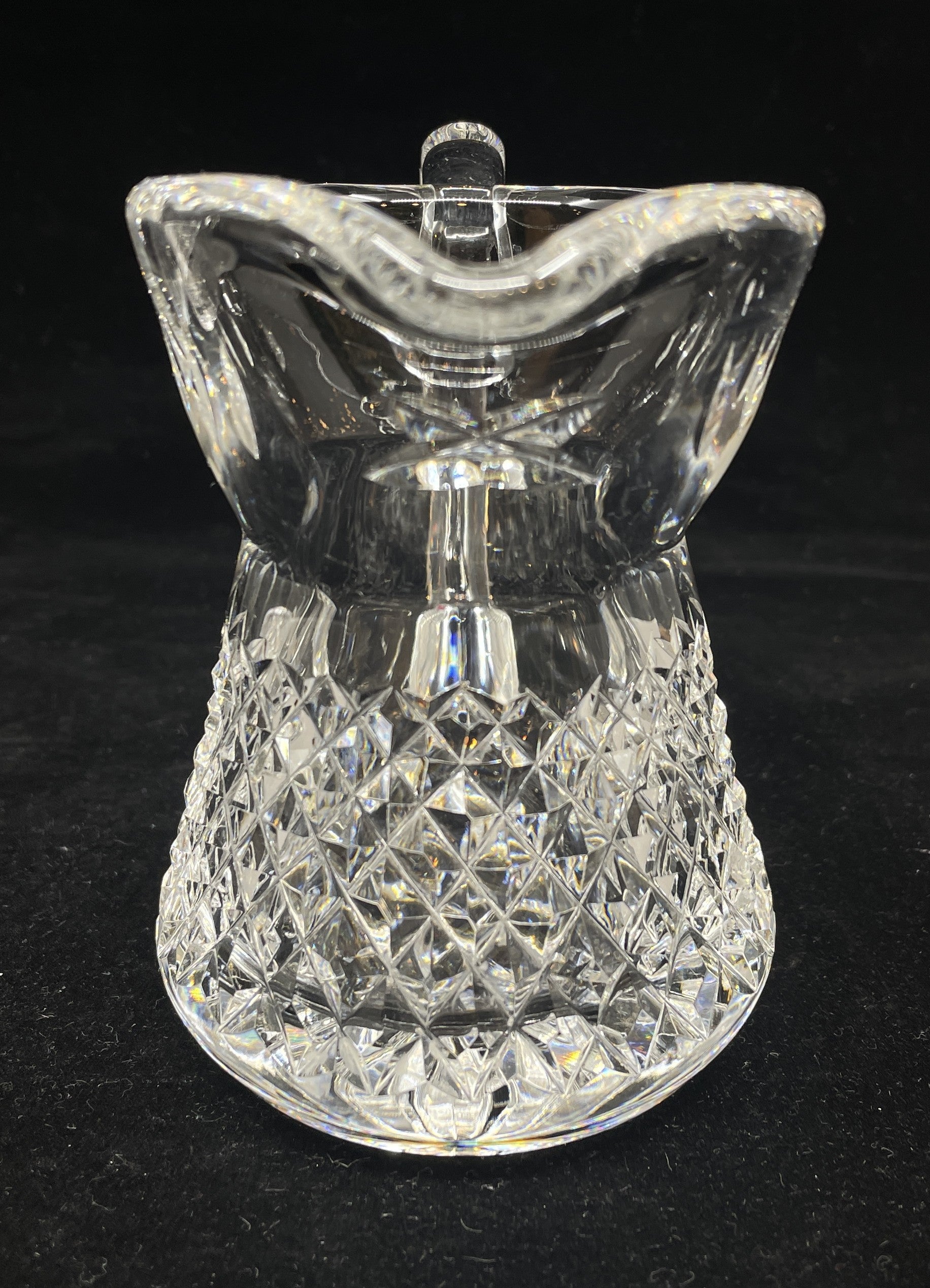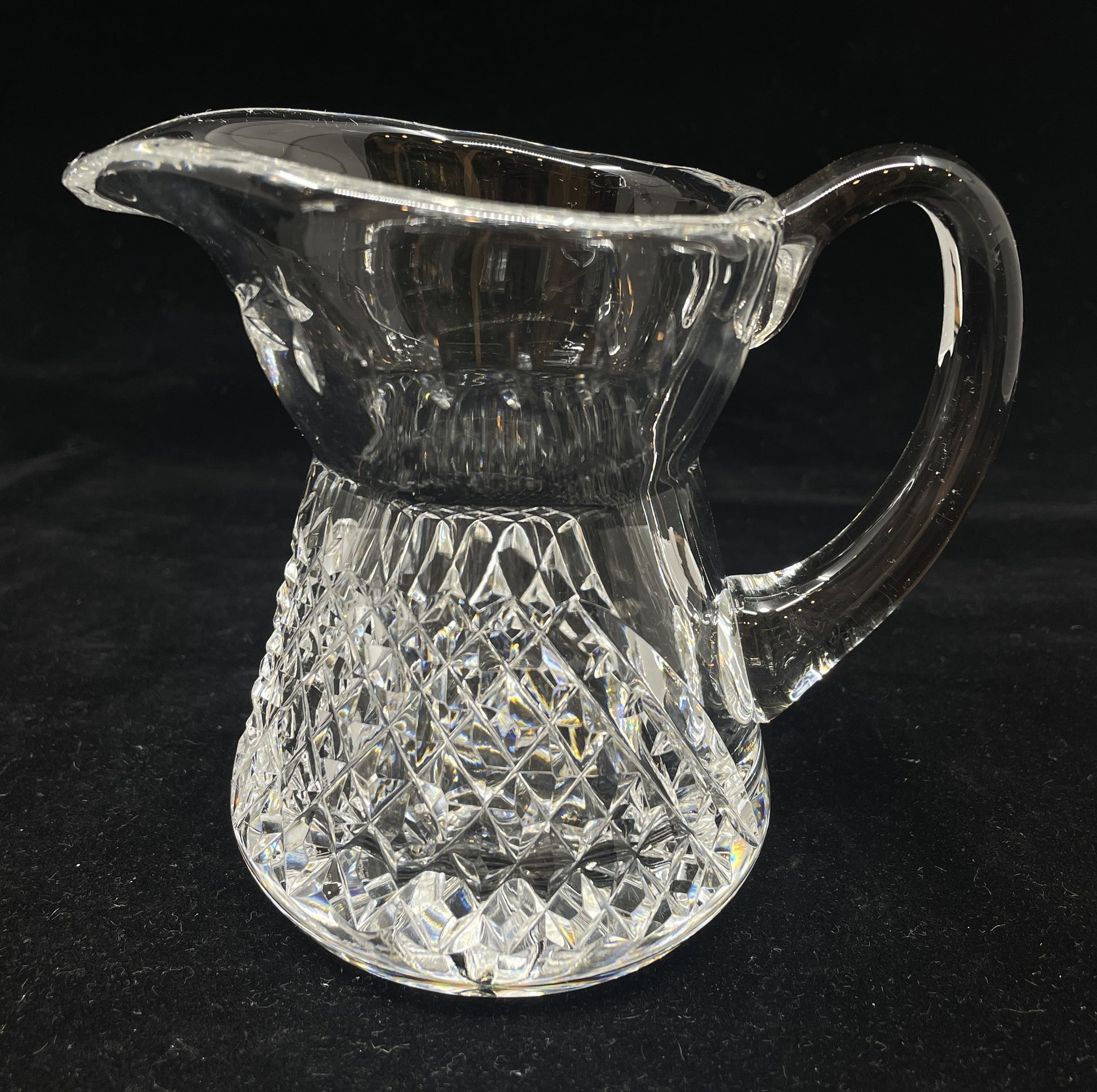 Waterford Irish Lace cream and sugar dishes. This stunning set of two dishes features a cut glass design. The creamer has a smooth handle and prominent pour spout. The sugar bowl is a sleek, round shape with a base that is slightly wider than its top. A stunning set that's sure to elevate a space.
