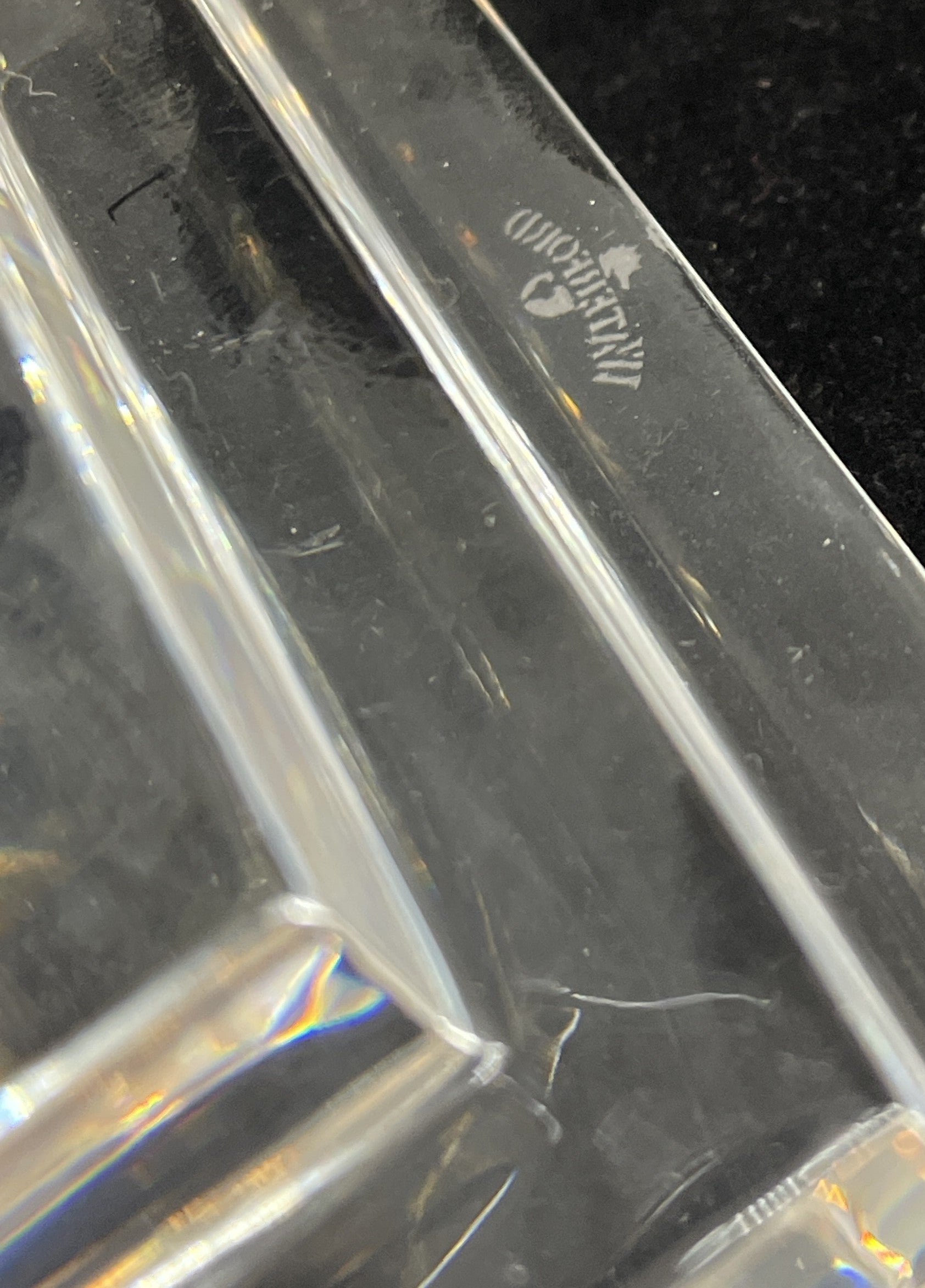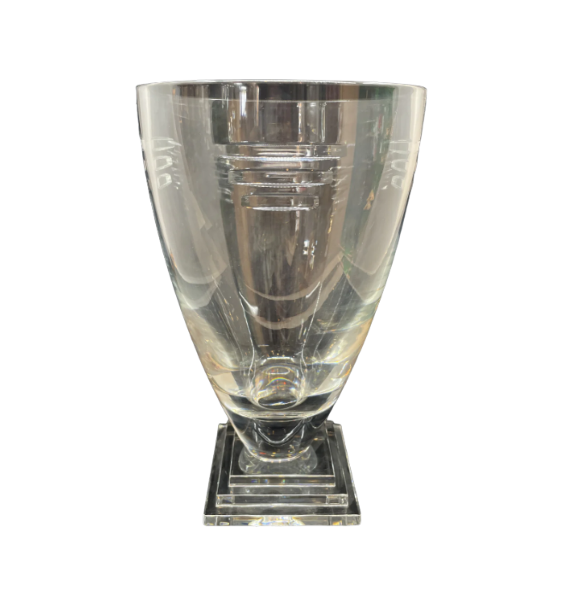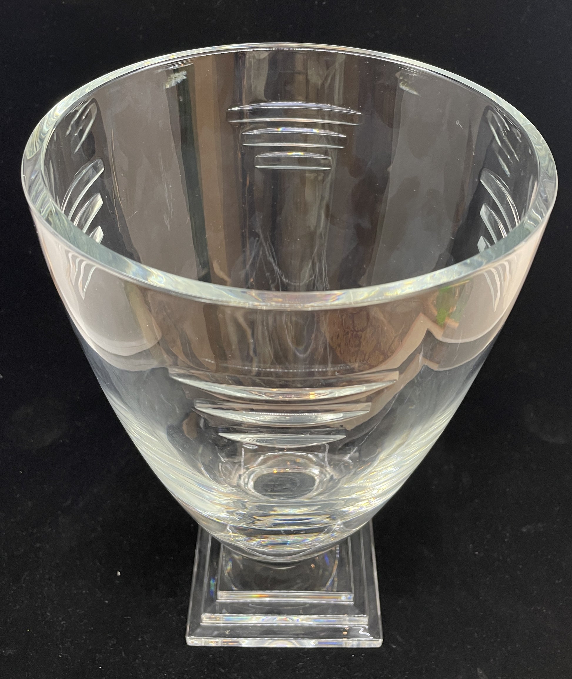 Large, modern vase from the Metropolitan collection by the brand Waterford. Features a tiered, geometric base with an elongated top adorned with cut line designs along 4 sides. A lovely modern accent piece to add class to any space! Waterford branding is present on the base of the vase.