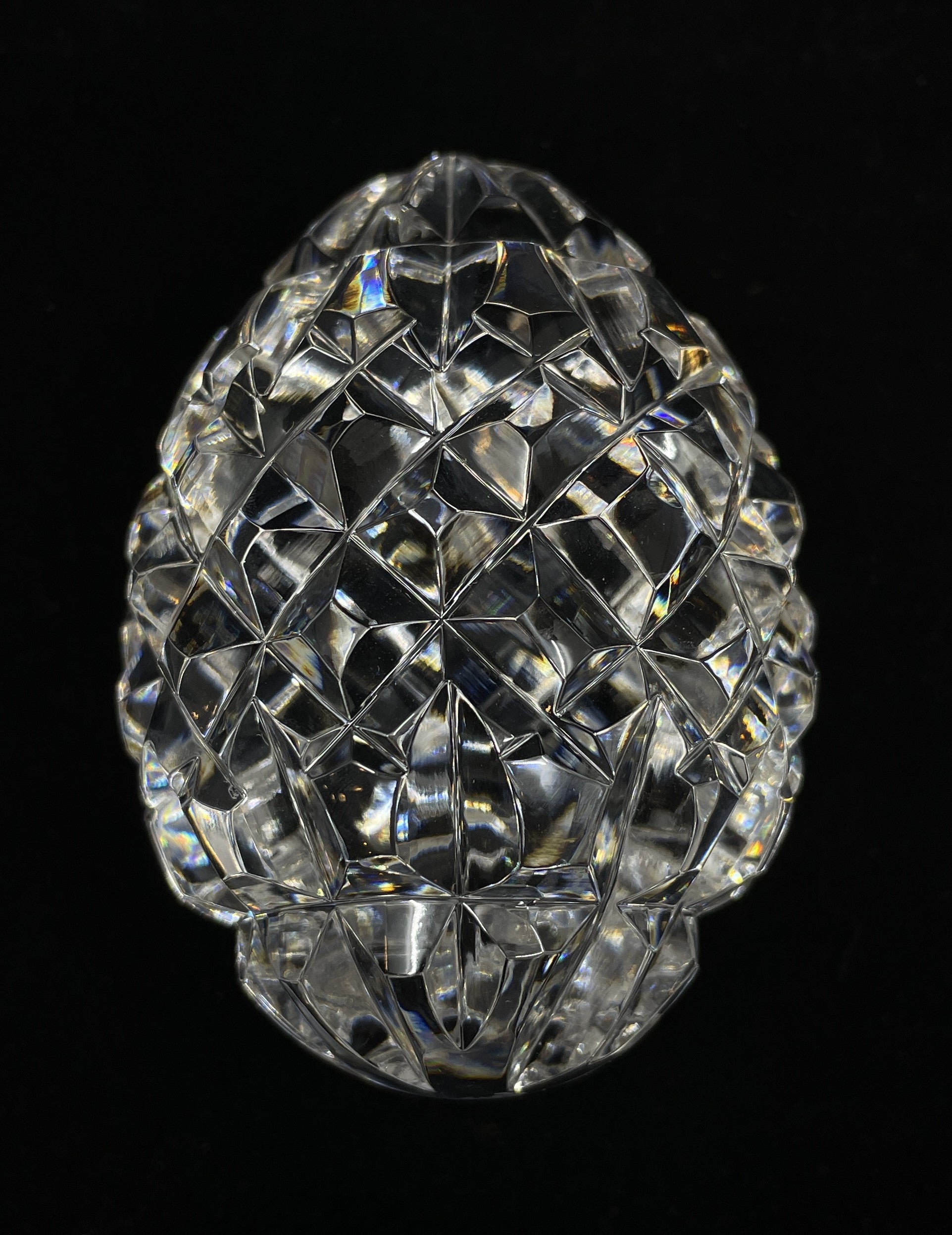 Waterford Rings Karo egg paperweight edition with box. This beautiful paperweight comes in two parts - a crystal egg and a silver plated stand. The egg features a beautiful cut glass design that reflects and refracts light beautifully giving it a stunning sparkle. The egg has an eye-catching crisscross cut pattern that creates many shimmering facets. The egg sits on a silver plated egg cup display stand with beautiful flourishing details. A gorgeous display piece that's sure to add a touch of luxury to any room.