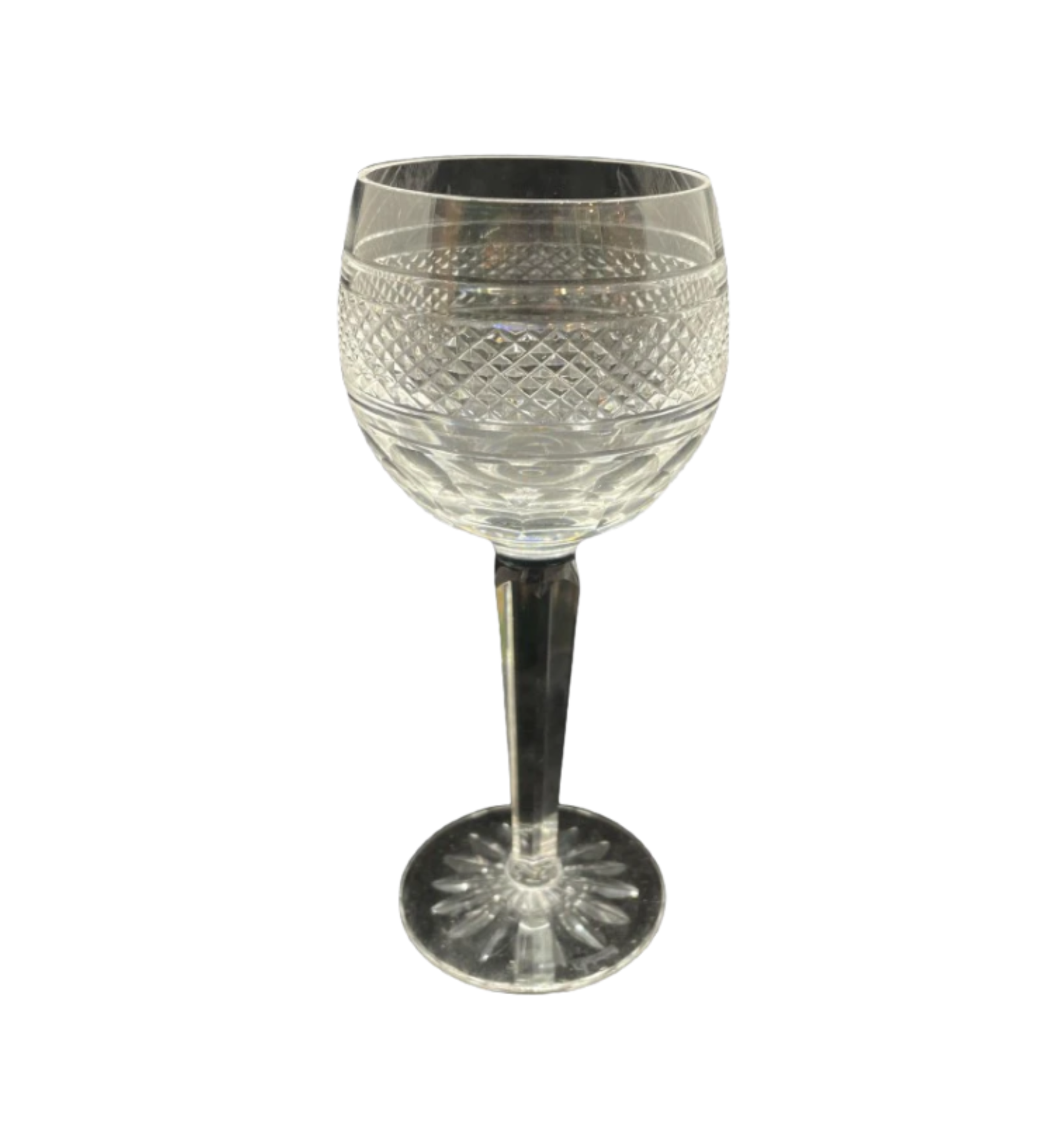 Beautiful hock style wine glass in the pattern Rossmore by the brand Waterford. Features a cut crystal band in a diamond pattern and a cut fanning floral pattern on the base. Waterford branding is also present on the base of the glass.
