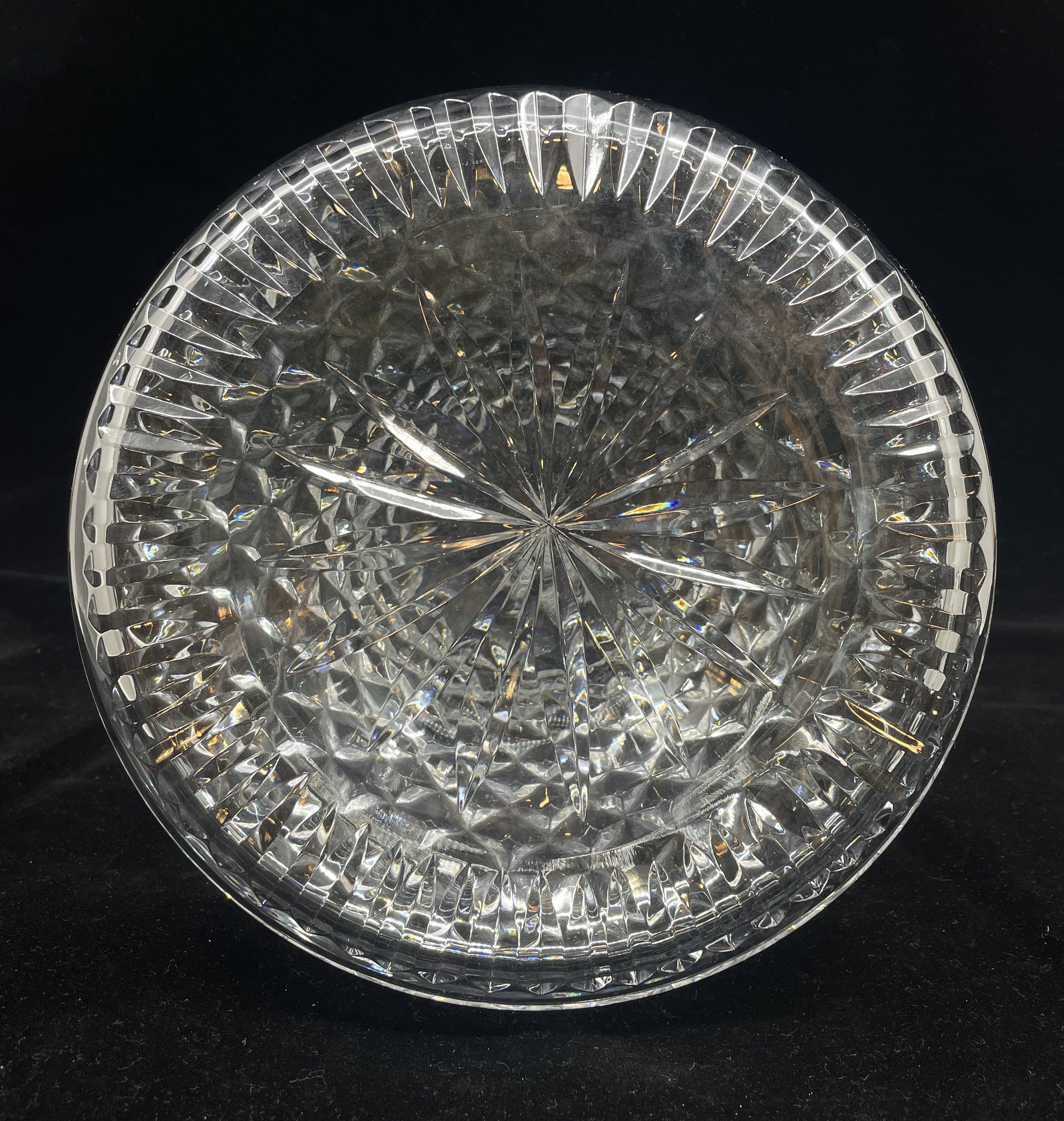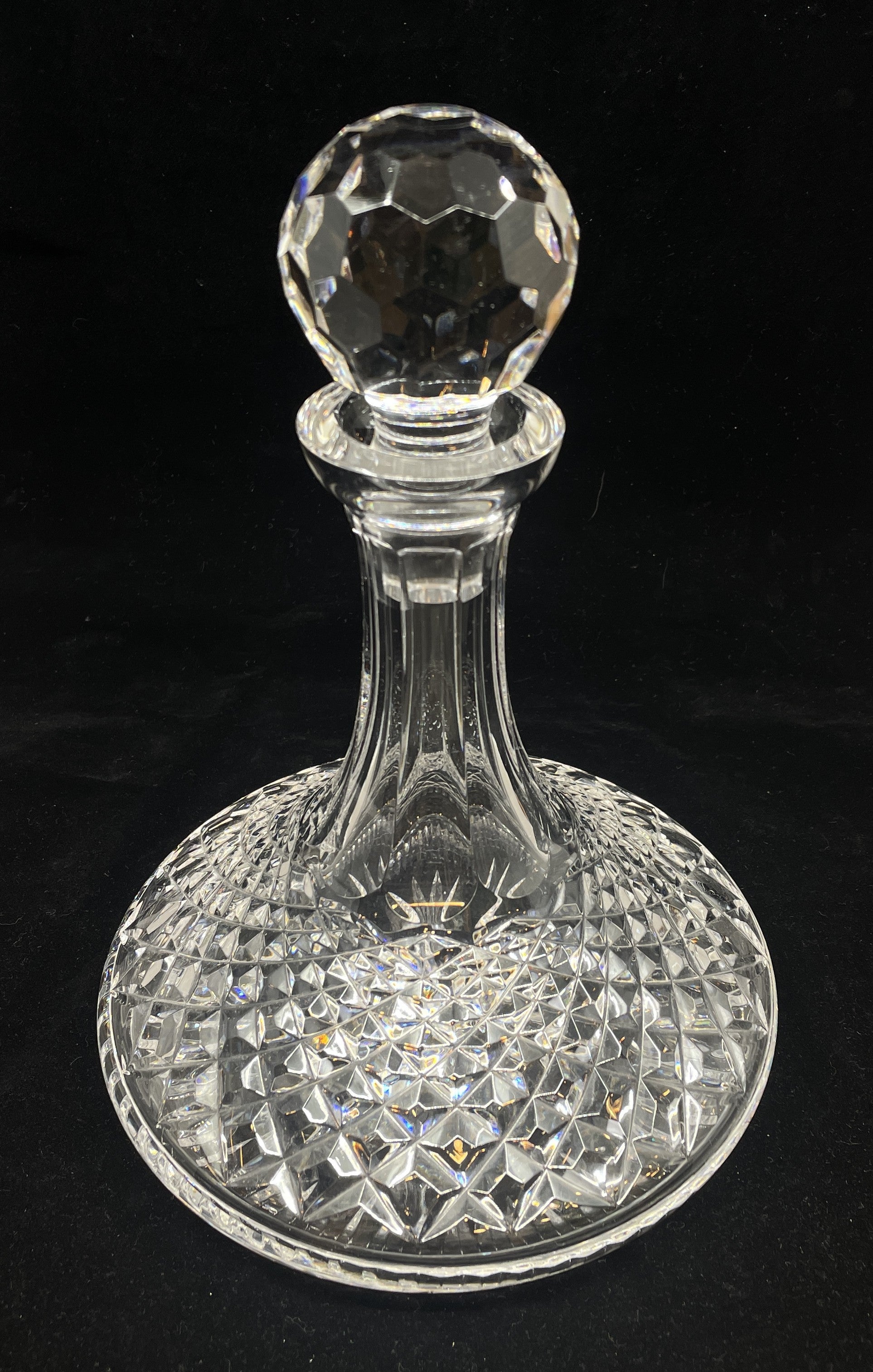 Waterford Lismore ships decanter. This beautiful piece features a wide base and narrow neck. The beautifully cut crystal glass sparkles in the light. A stunning piece that's sure to elevate a setting.