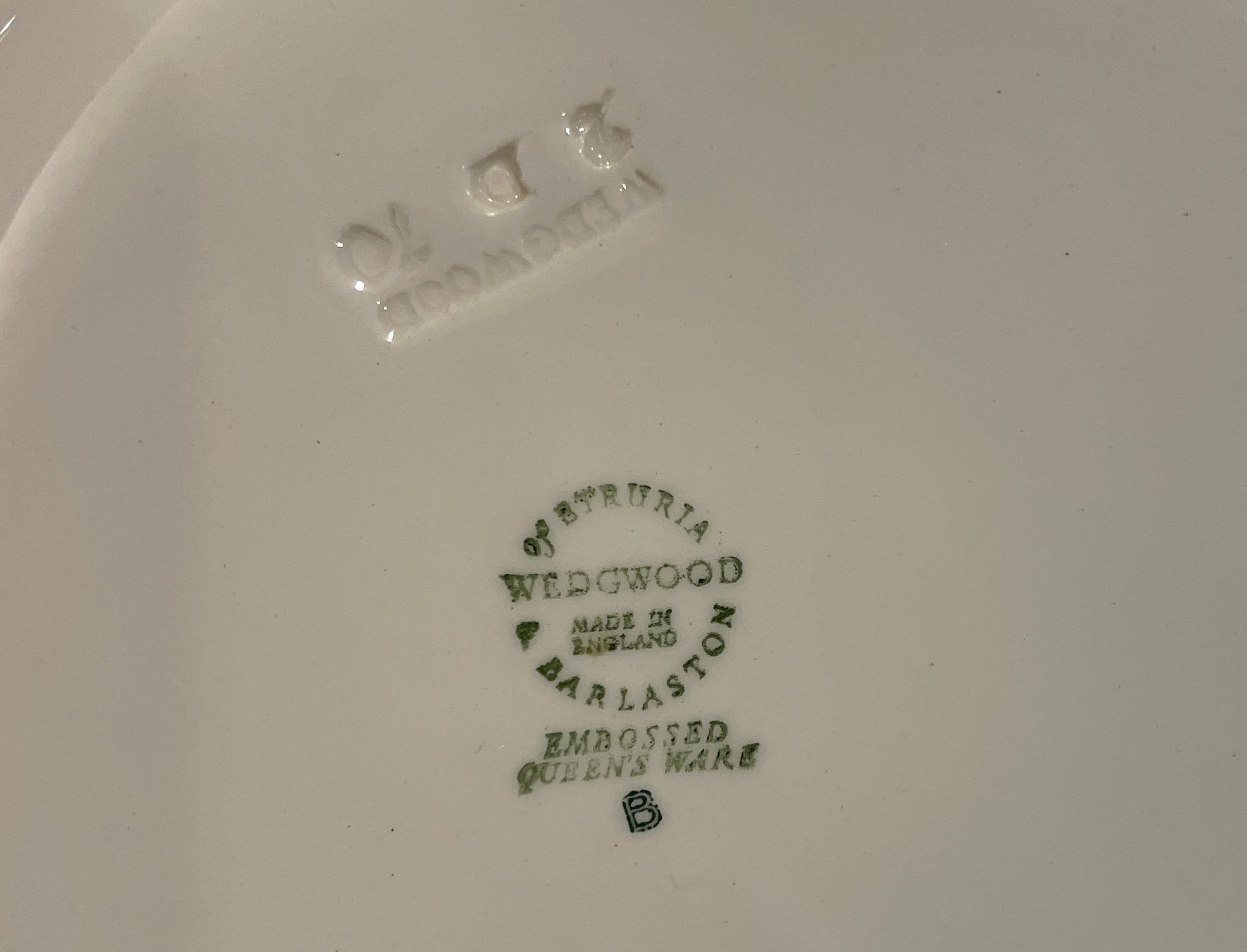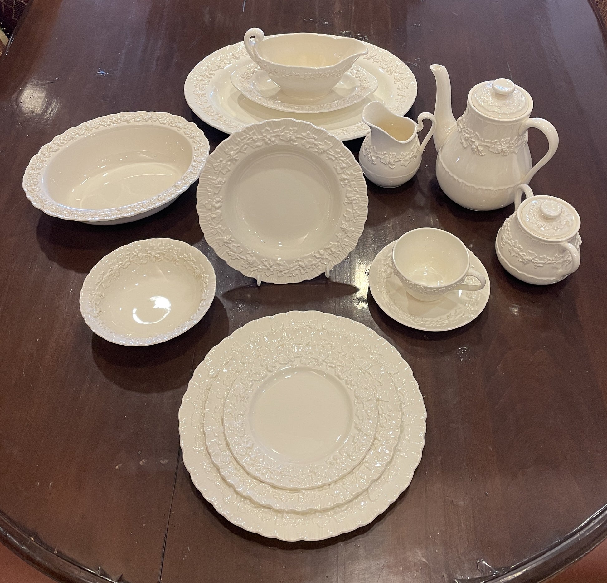 Wedgwood Etruria Queensware. This stunning set of china features a beautiful embossed grape vine motif on each piece. The rims of the plates and bowls have a scalloped edge. The beautiful cream on cream design allows for a subtle yet intricate design which makes this set a versatile and eye catching display. The set includes 11 dinner plates, 10 salad plates, 11 bread and butter plates, 6 berry bowls, 11 cups, 10 saucers, 2 oval vegetable bowls, 1 gravy boat, 1 teapot, 1 oval platter, 1 cream and sugar, and 2 soup bowls. A classy and timeless set that is sure to elevate a space.