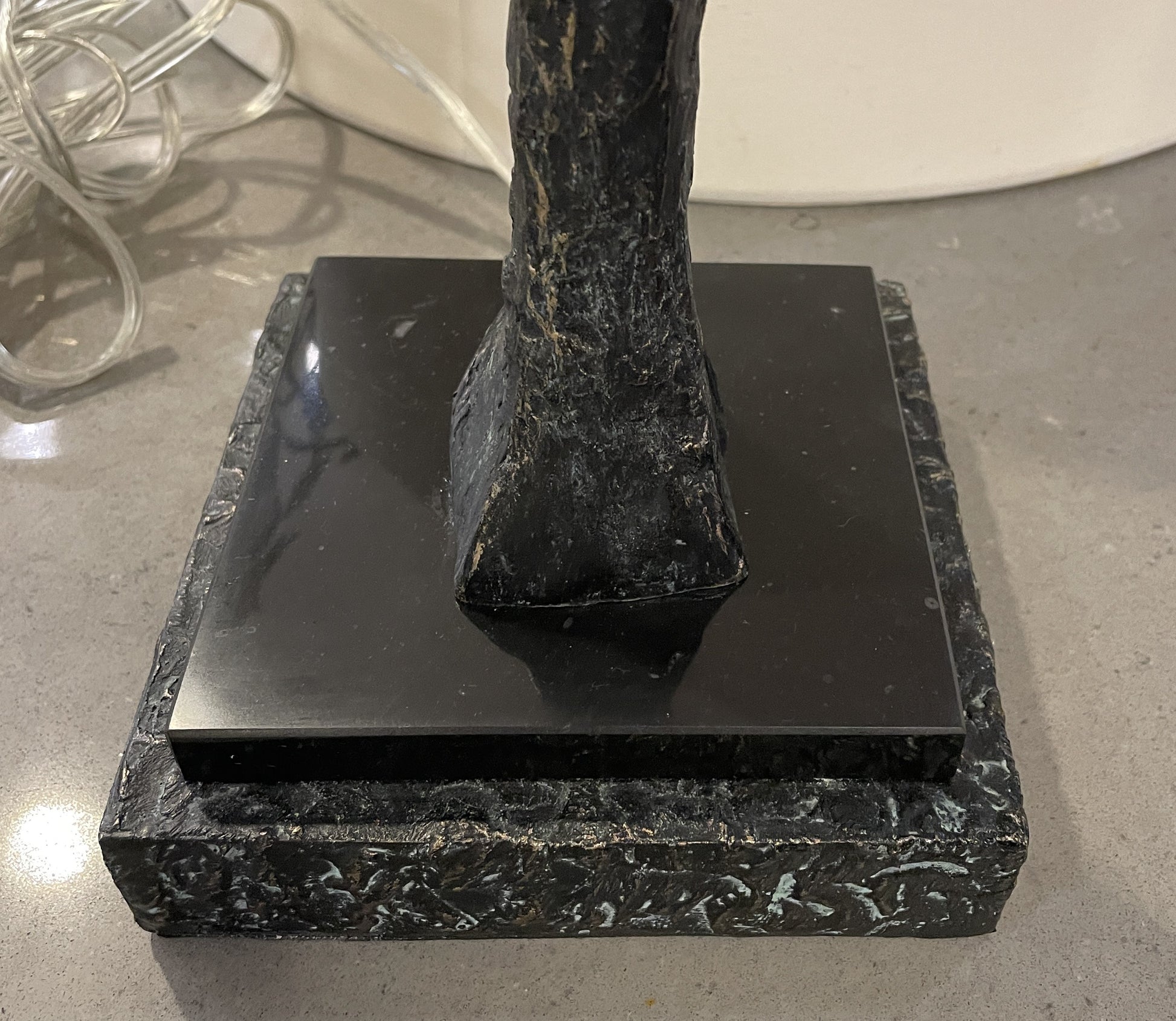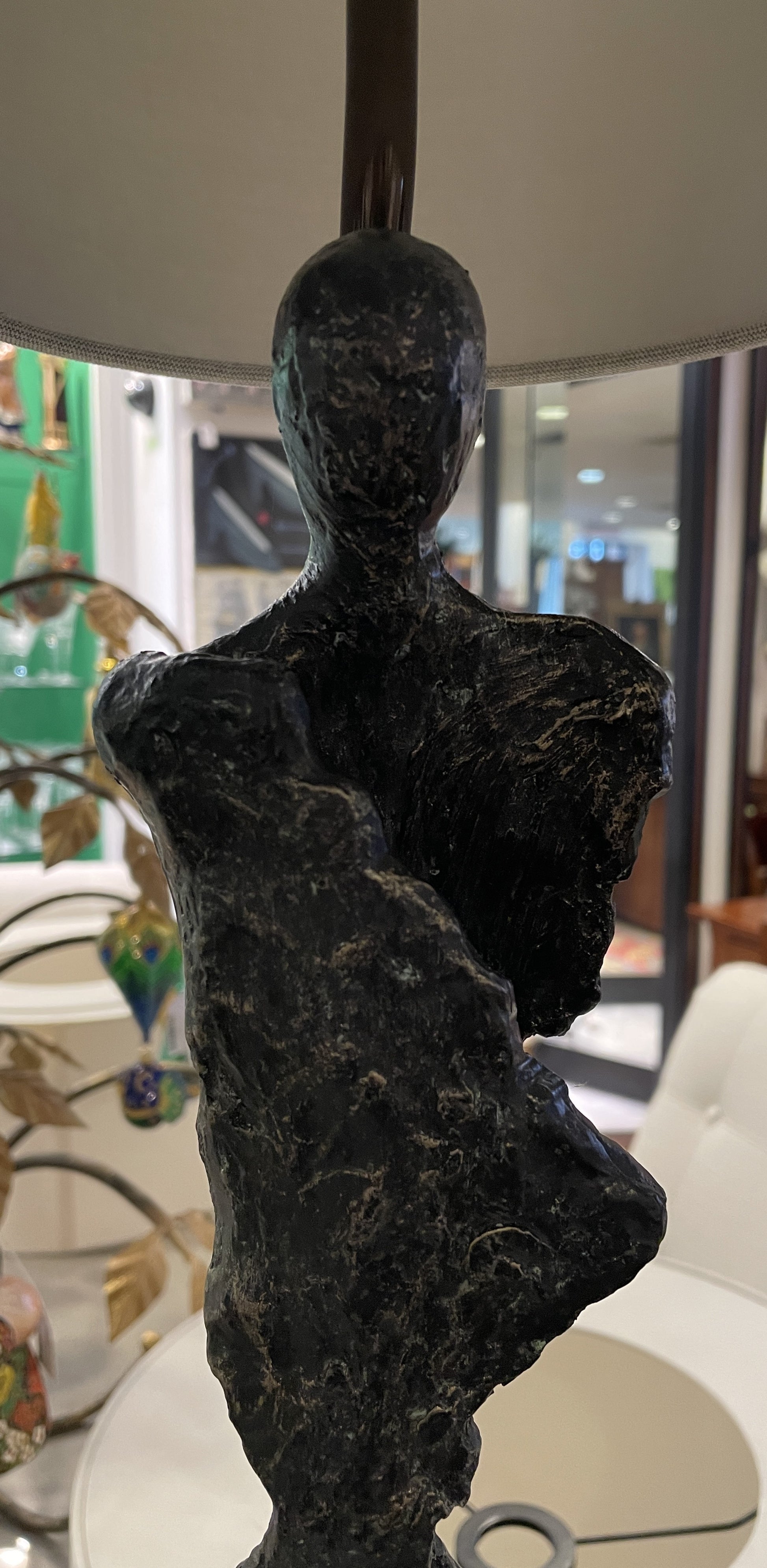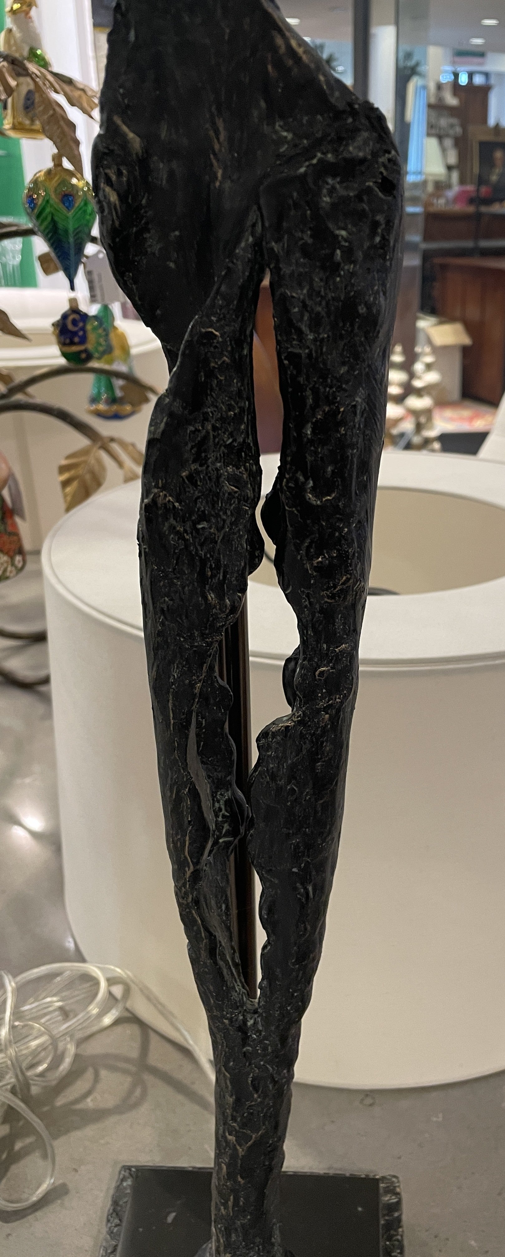 Wildwood "Artemis" and "Gertrude" pair of figural buffet lamps. This gorgeous pair of lamps features two similar, but not the same design stands. The base of each lamp is the same - a square base with a textured lower pedestal and smooth upper stand. Each stand leads into their respective figure. The one with hair is "Gertrude", and the one without is "Artemis". Both figures have organic forms for bodies that allude to a human figure, but have a rock-like rough appearance as well. The two stands lead up to the same tall, cylindrical shade that covers the one light bulb socket. From the top of the shade peeks out a little V-shaped finial. An elegant set of lamps with an artistic touch that is sure to brighten up any space.
