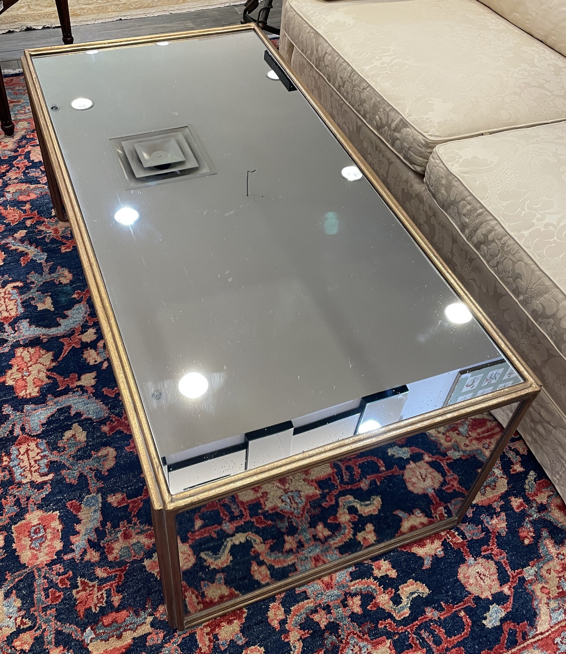 Wisteria Waterfall mirrored coffee table. This beautiful coffee table is covered in mirrors. The table has a modern shape that has two long "legs" that span the length of the short sides of the piece. The edges of each mirror piece are joined with a gold border that contrasts the silver tone of the mirror beautifully. A charming piece with versatile style and a streamlined design.