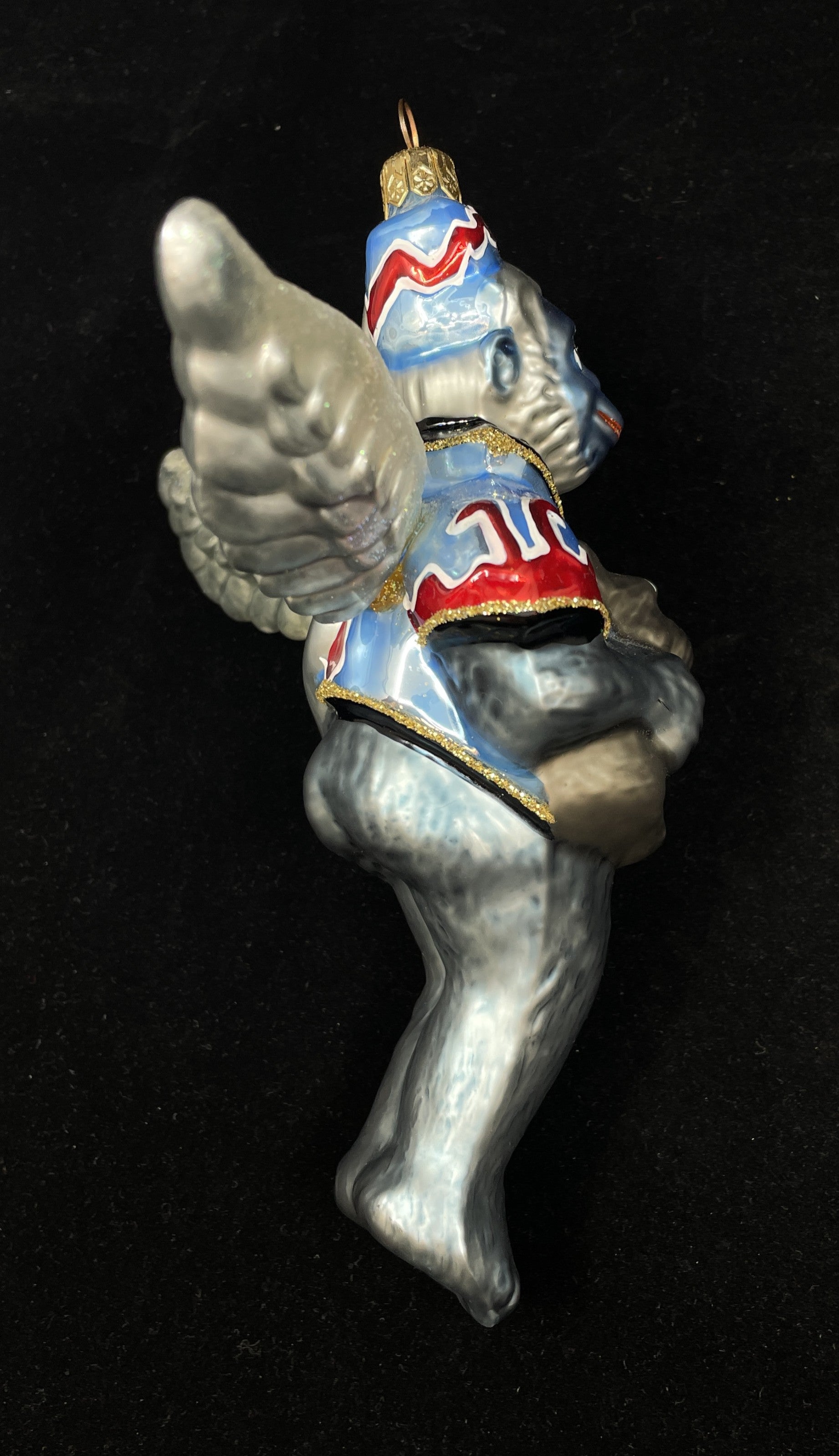 Kurt Adler Polonaise The Wizard of Oz flying monkey ornament. This charming glass ornament depicts one of the witch's flying monkeys holding toto. The monkey is gray and wears blue and red clothes. A charming collectible ornament that's sure to be a conversation piece on any tree.